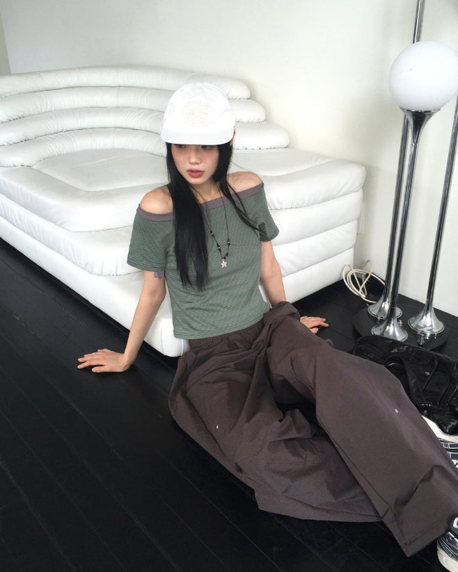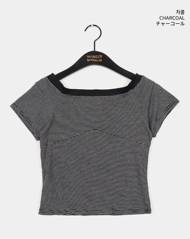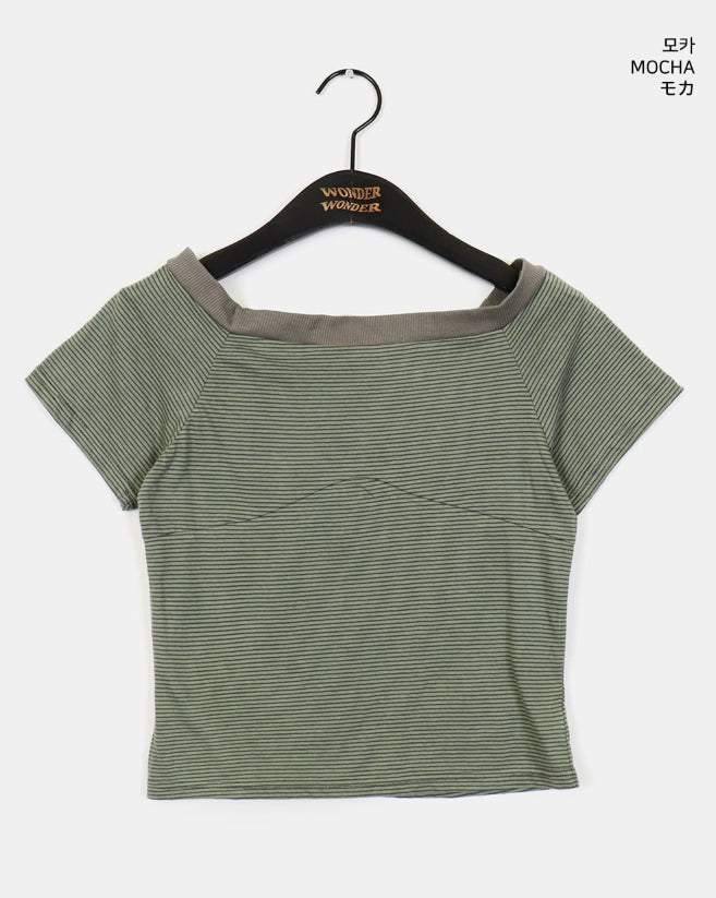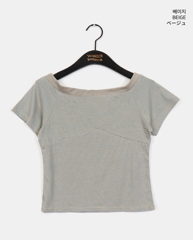 Rutot Stripe Color Off-Shoulder Short-Sleeved T-Shirt