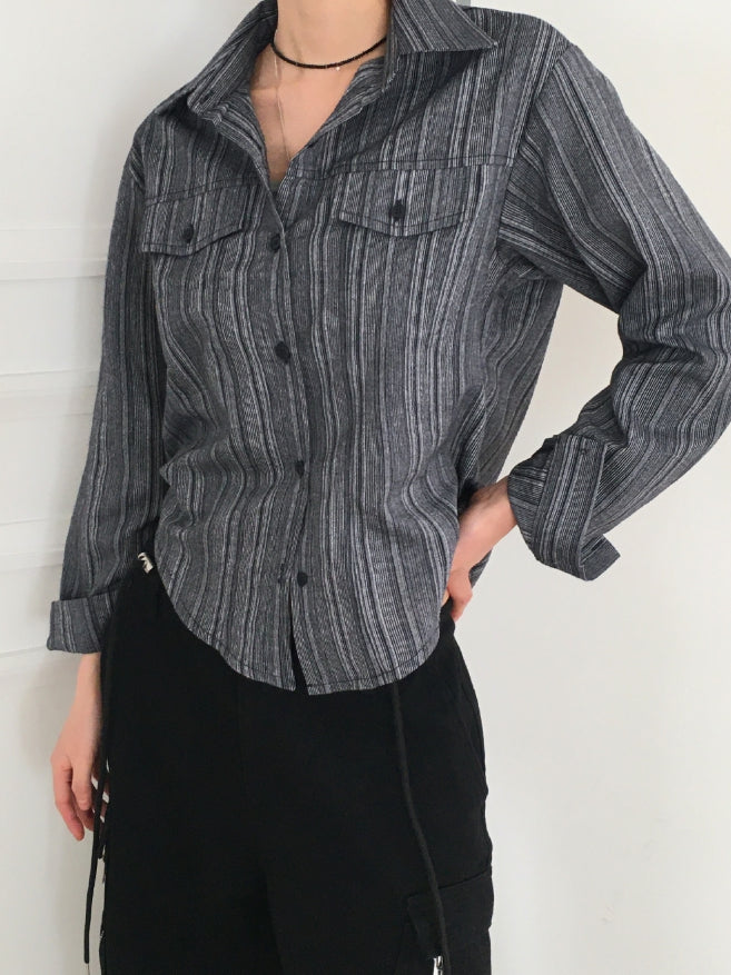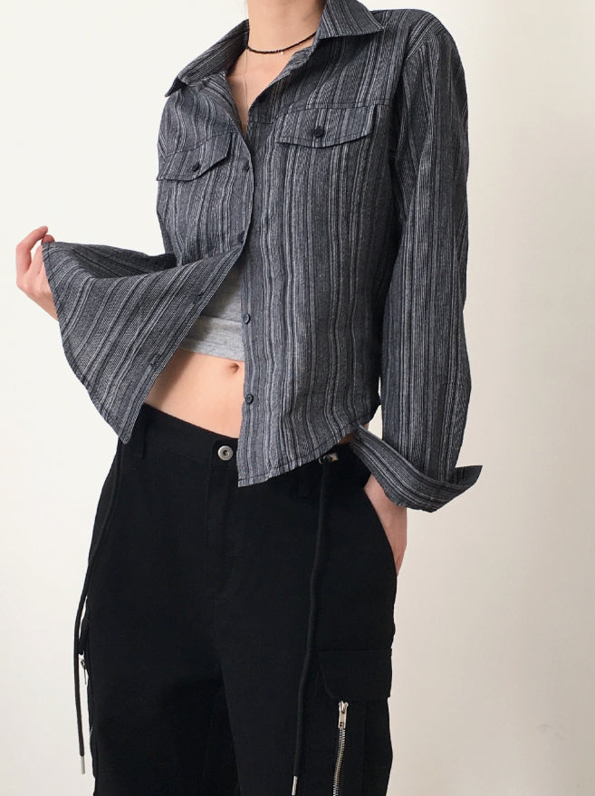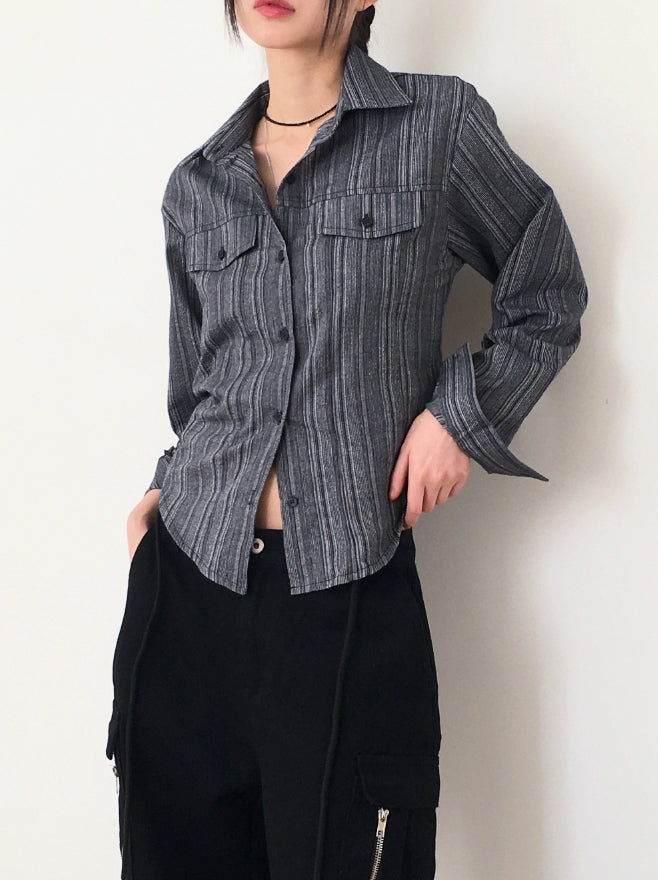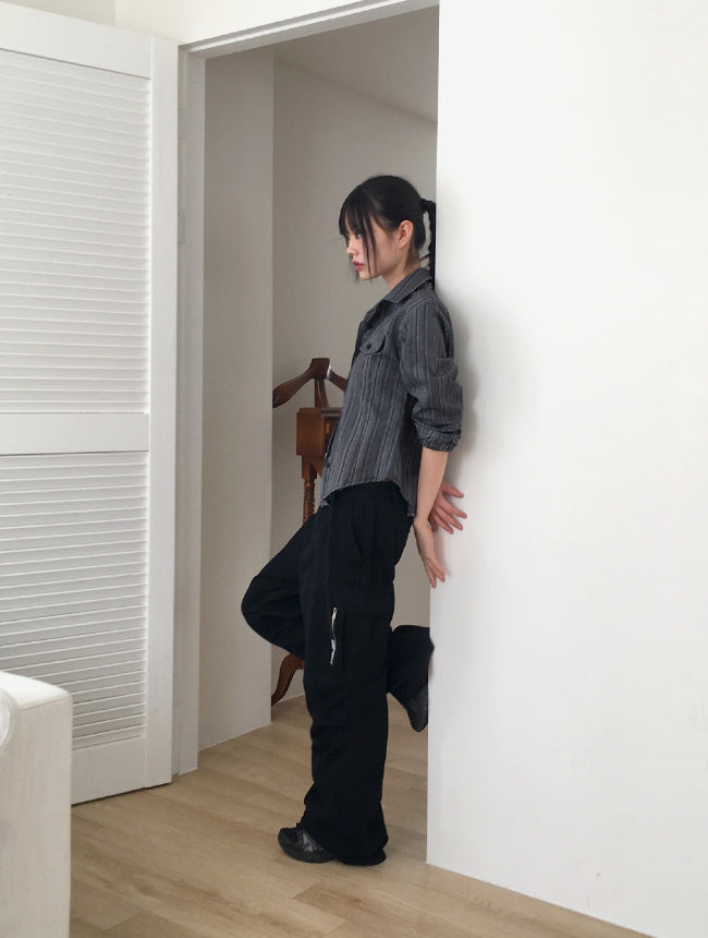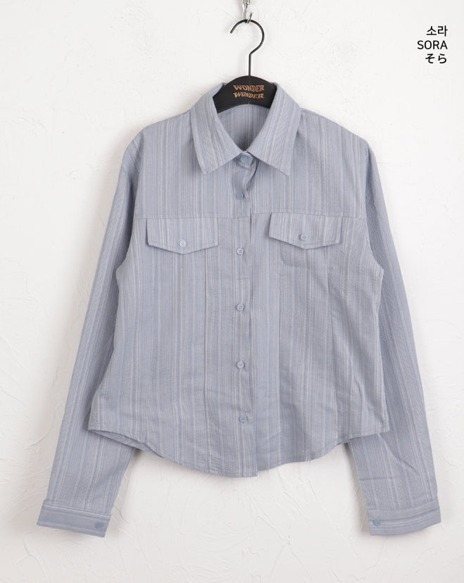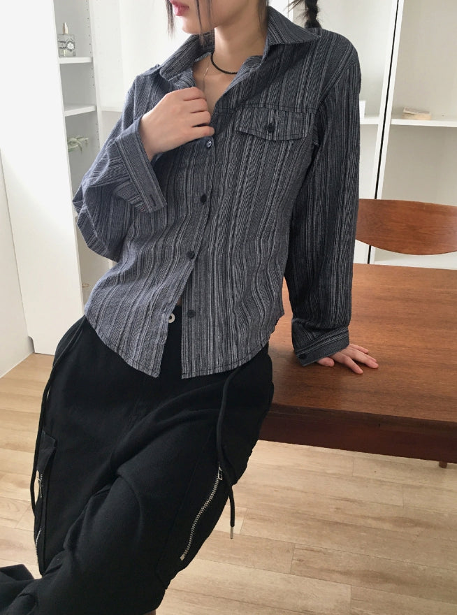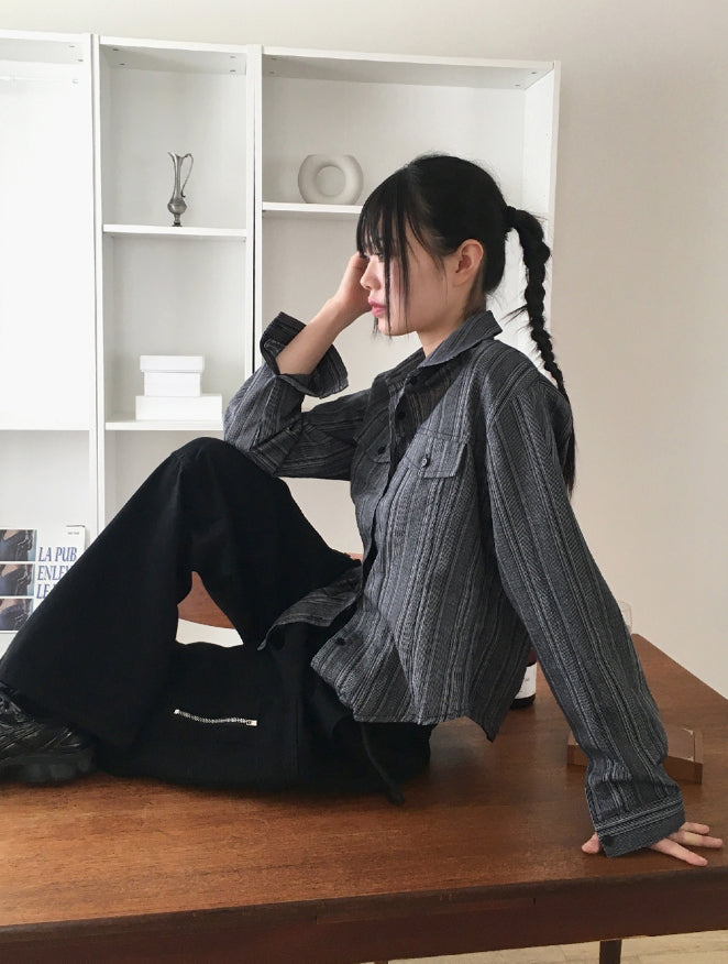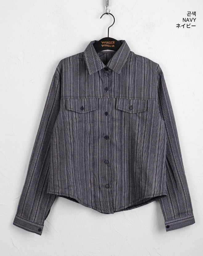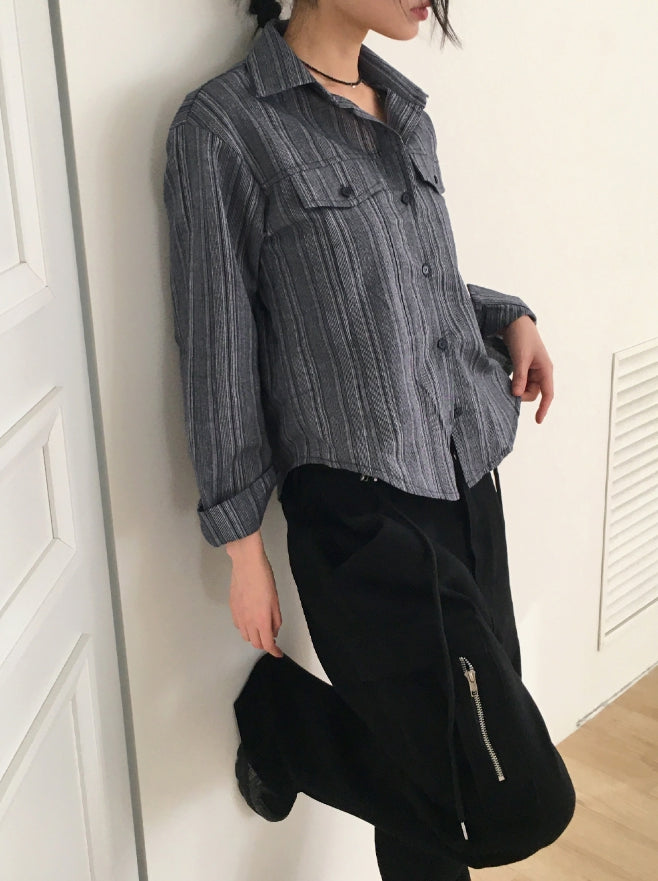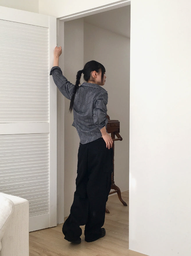ASAHI Vintage Stripe Pocket Roll Crop Long-Sleeved Shirt