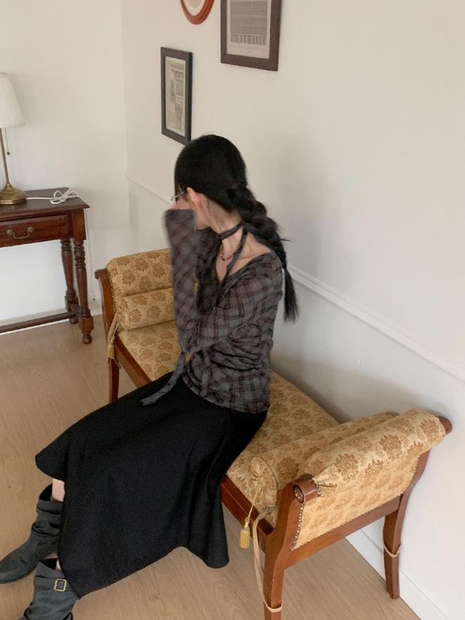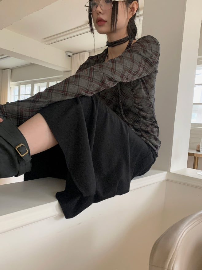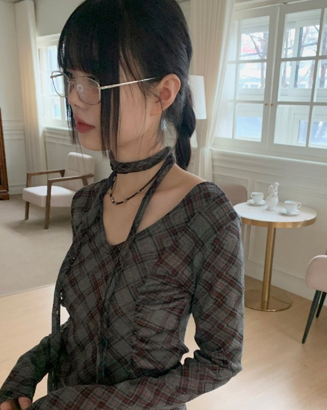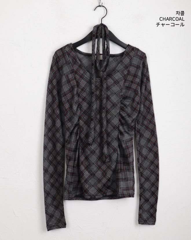 [Scarp set] Feld Checkered See-through Shirring Long Sleeve T-shirt