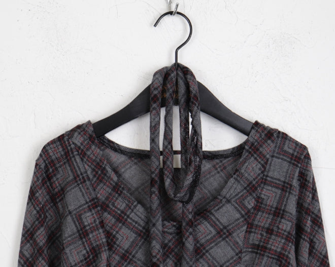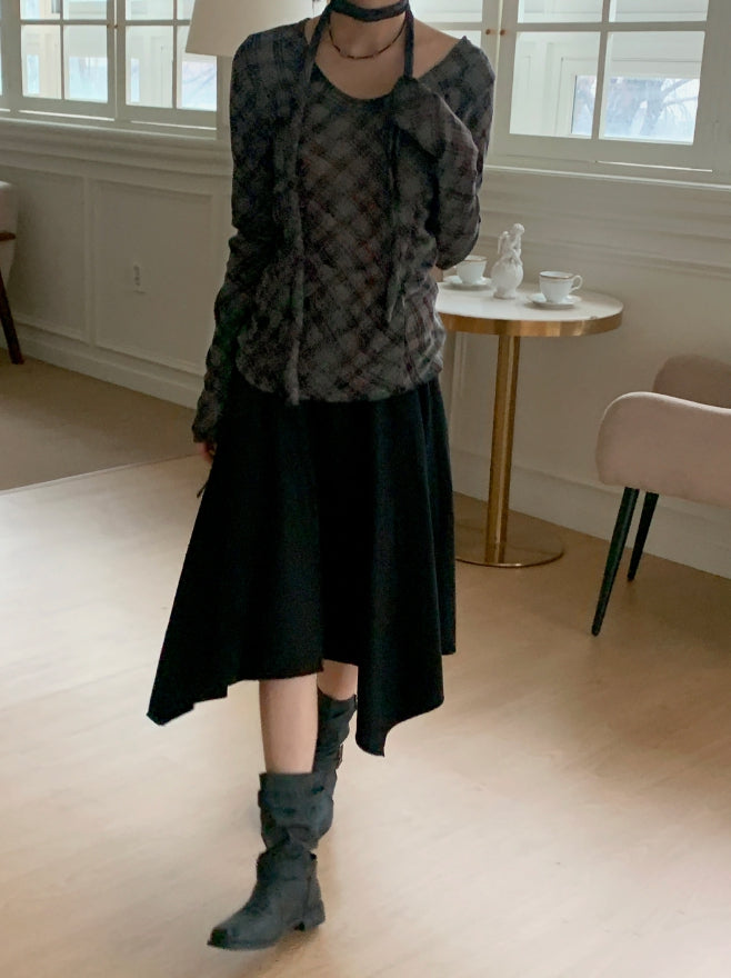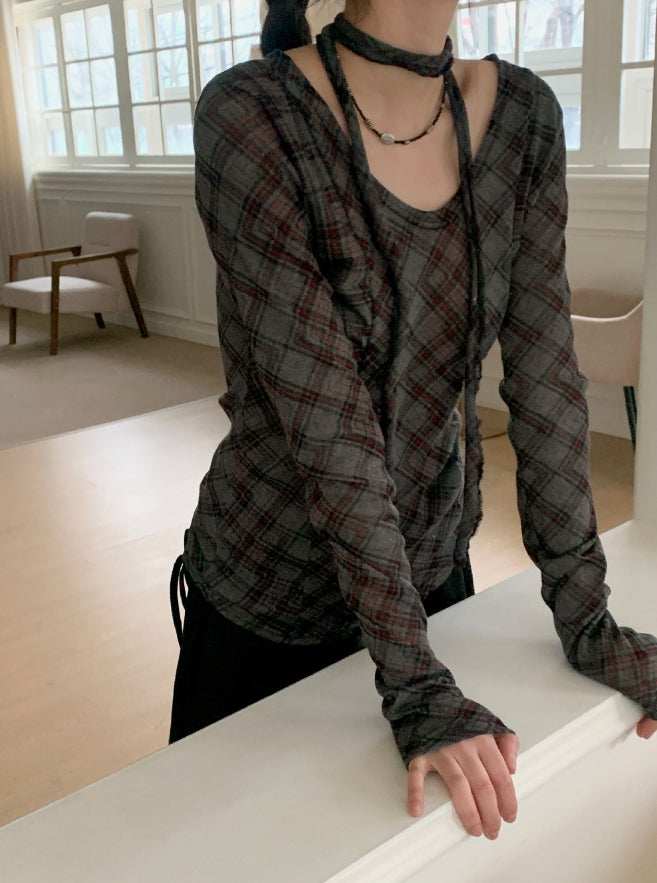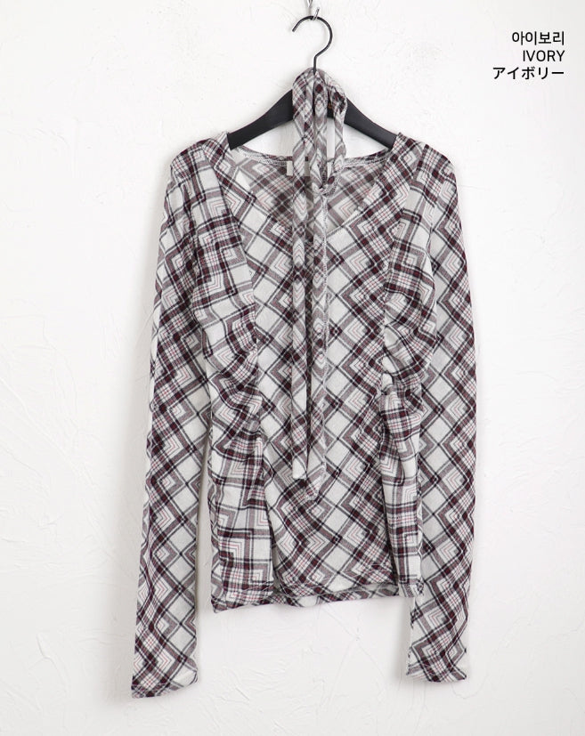 [スカーフセット]フェルドチェックシースルーシャーリング長袖Tシャツ