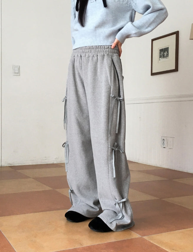 両面起毛セントバルーンサイドリボンフレンチパイル生地トレーニングロングワイドパンツ