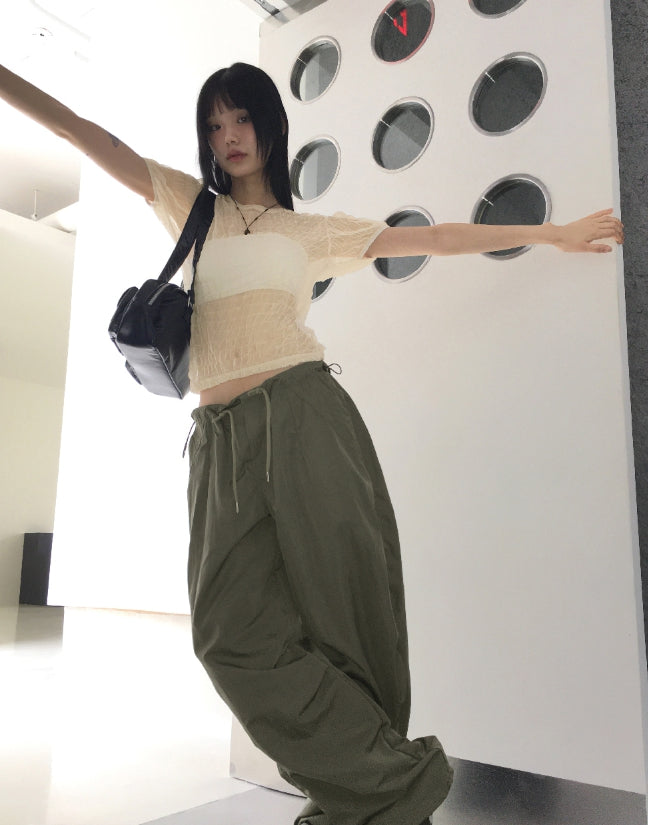 Shange shirring pleated see-through puff short-sleeved T-shirt