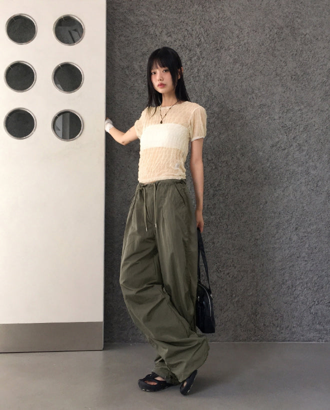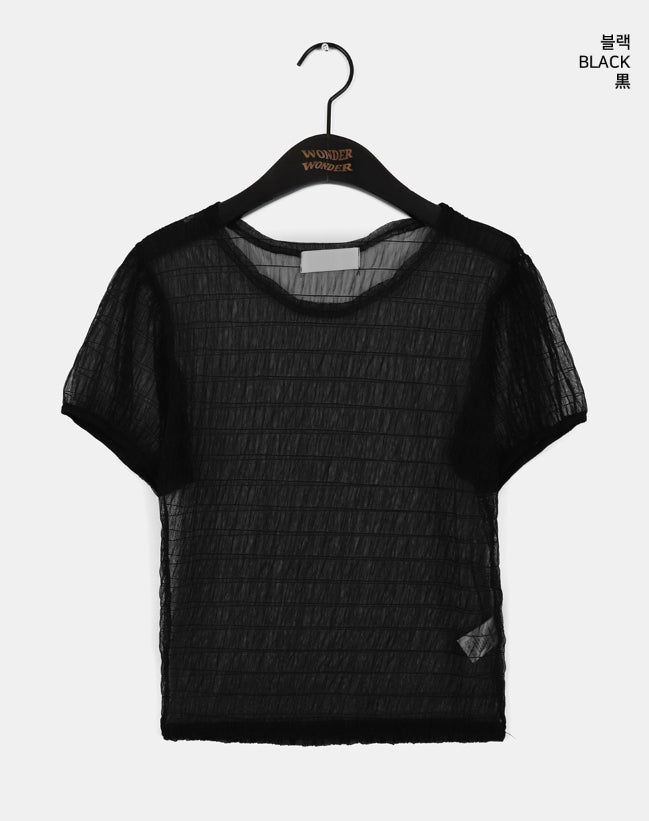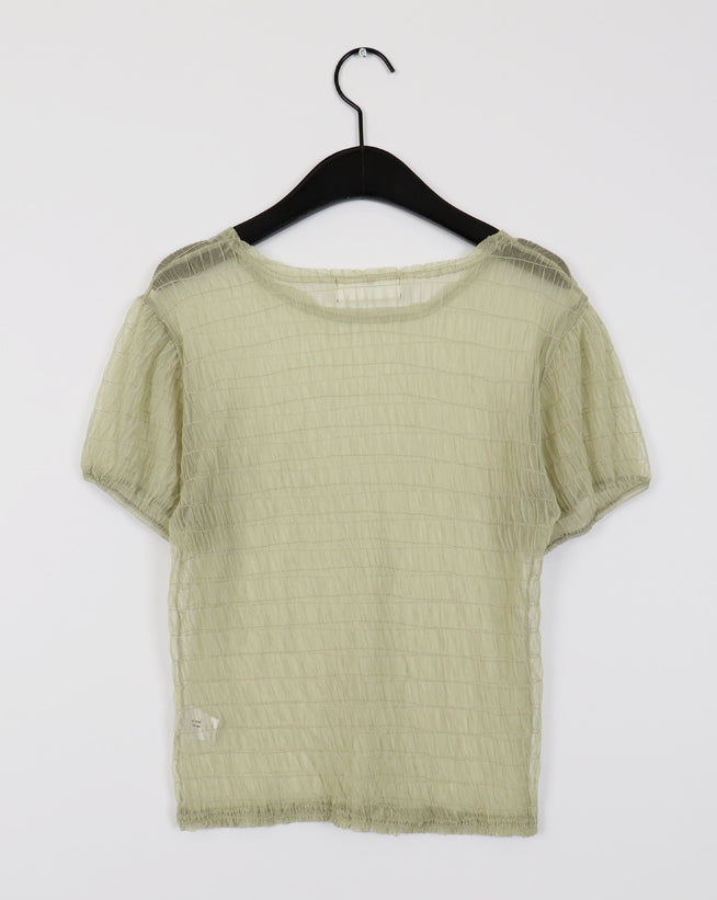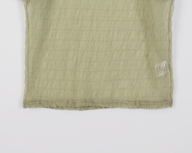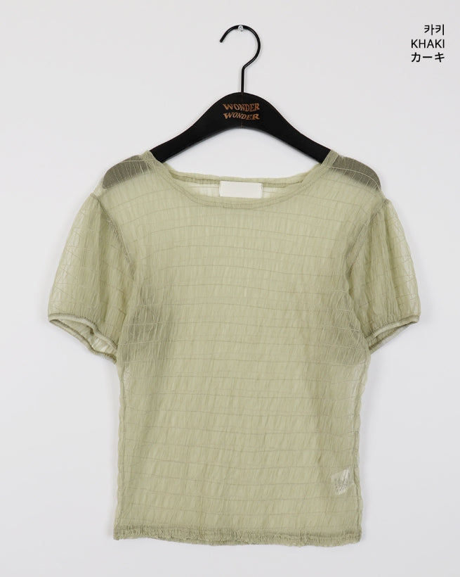 Shanz shirring pleated see-through puff short sleeve T-shirt
