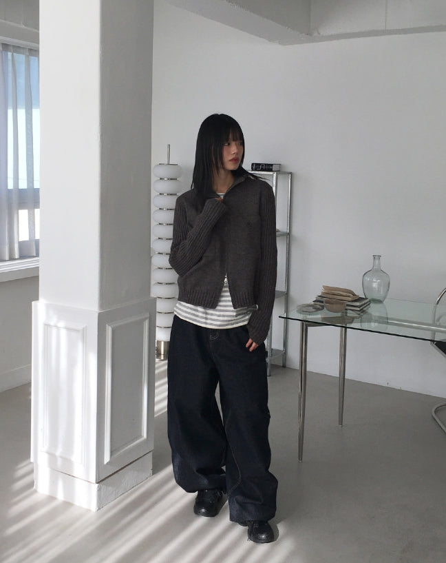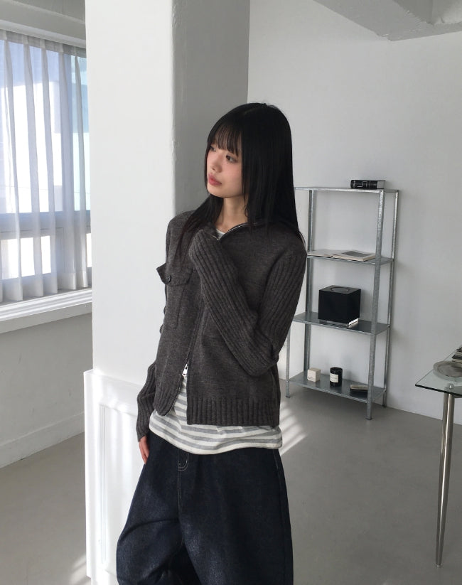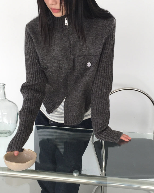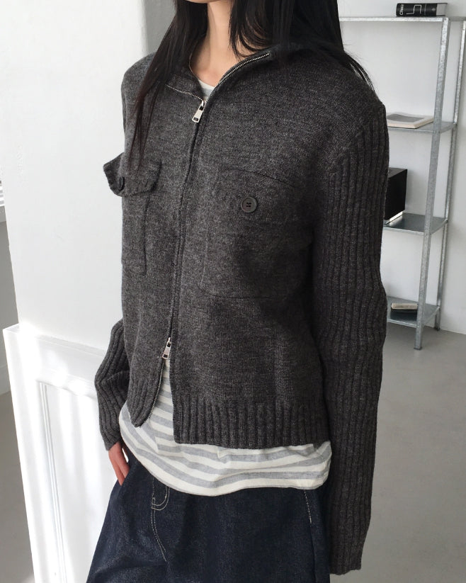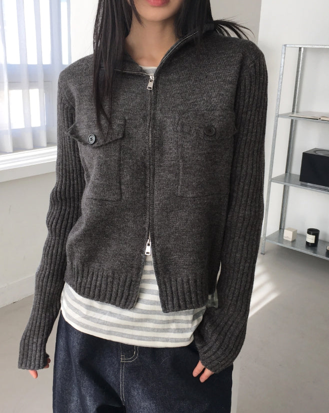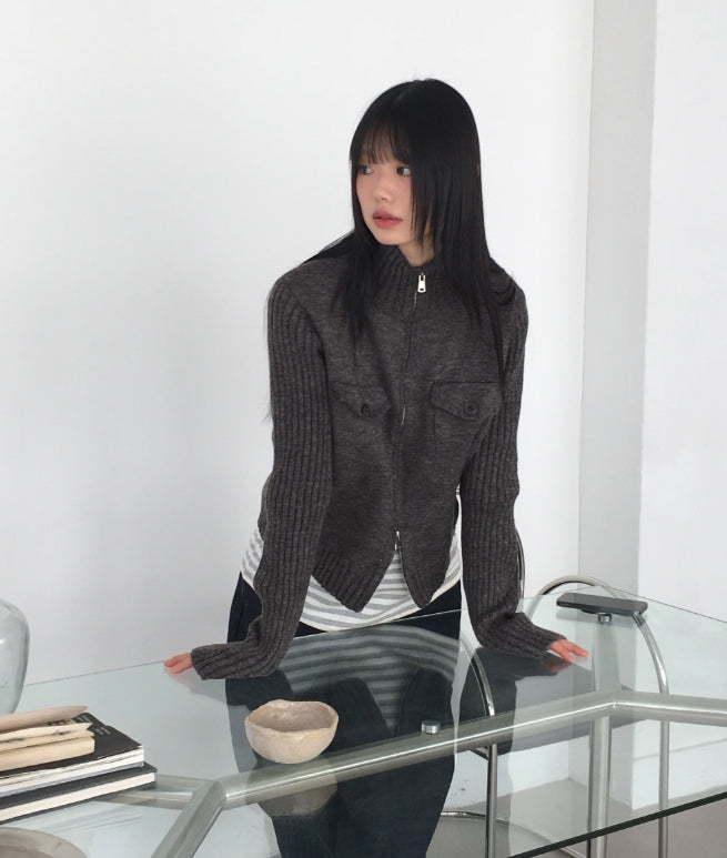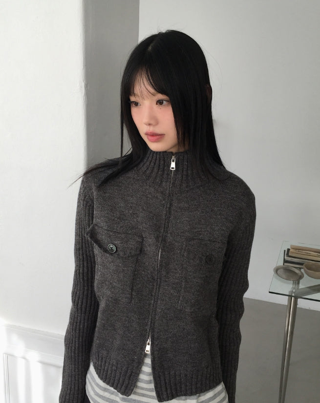 Siemen Ribbed High-Neck Pocket Two-Way Knit Zip-Up