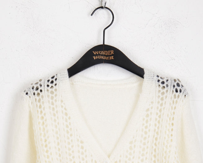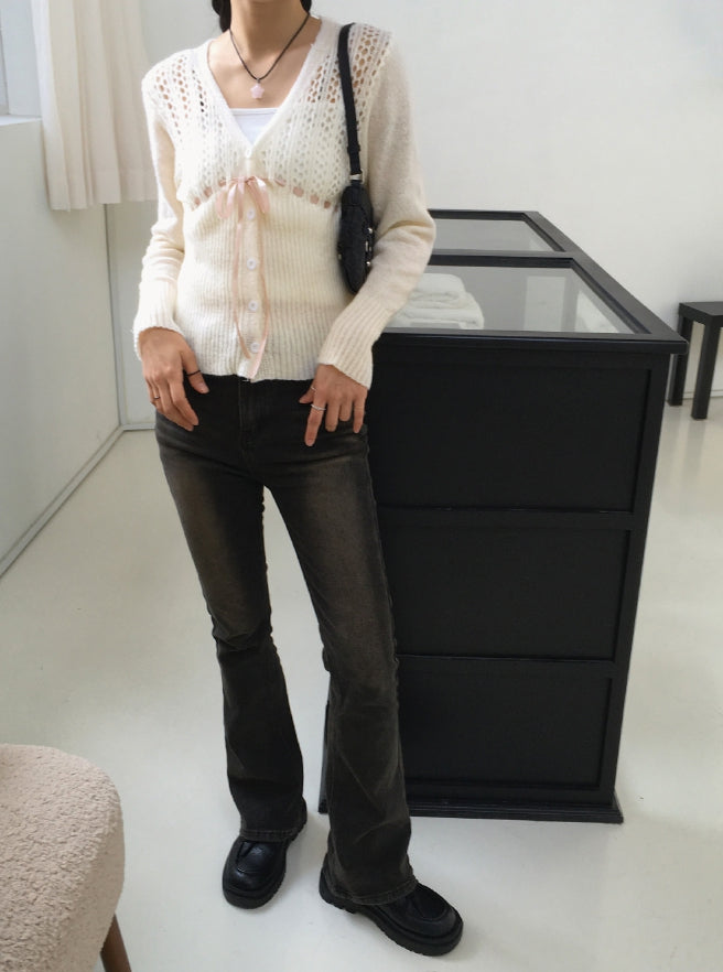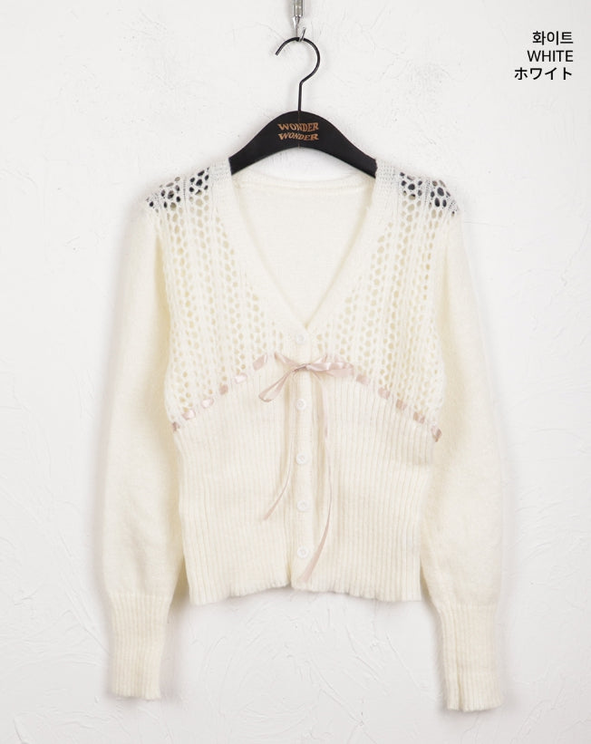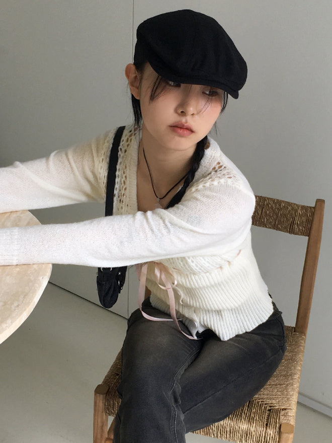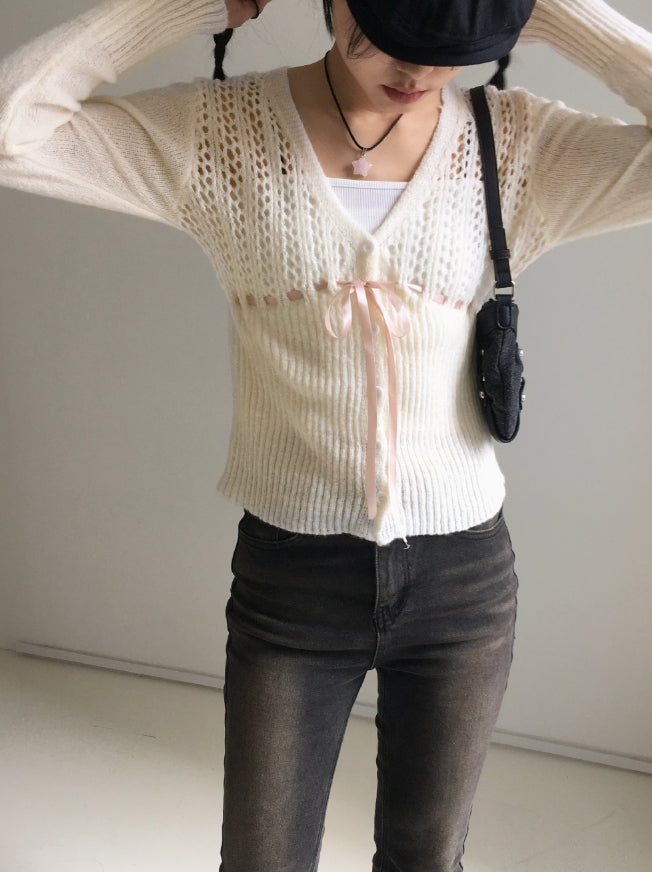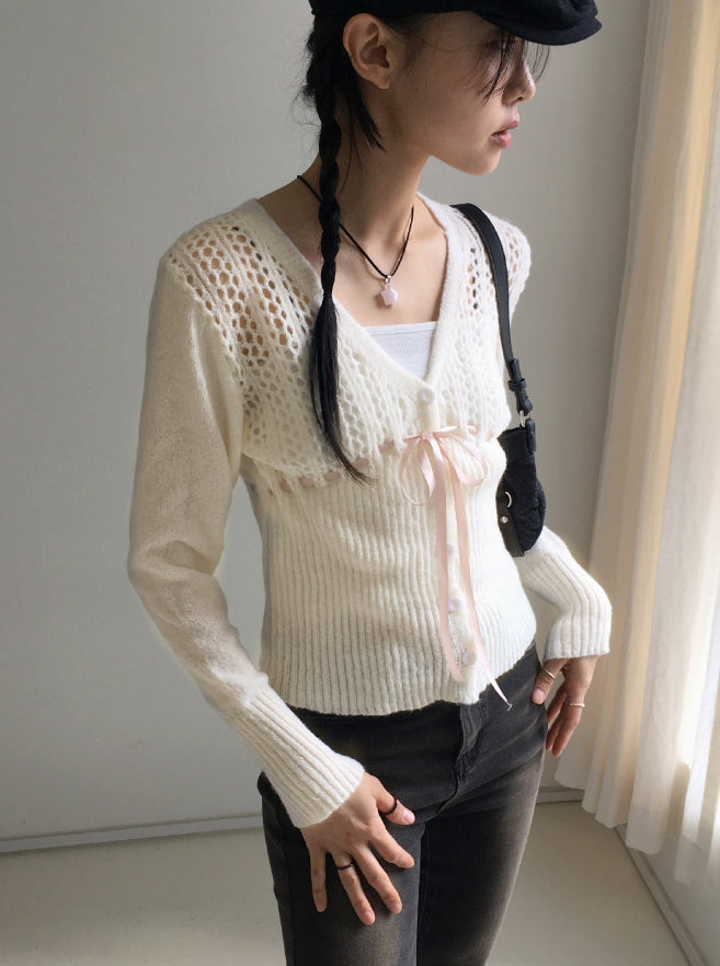 Sime Balletcore Ribbon String Punching Knit Cardigan