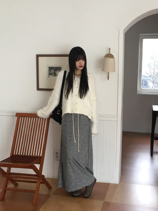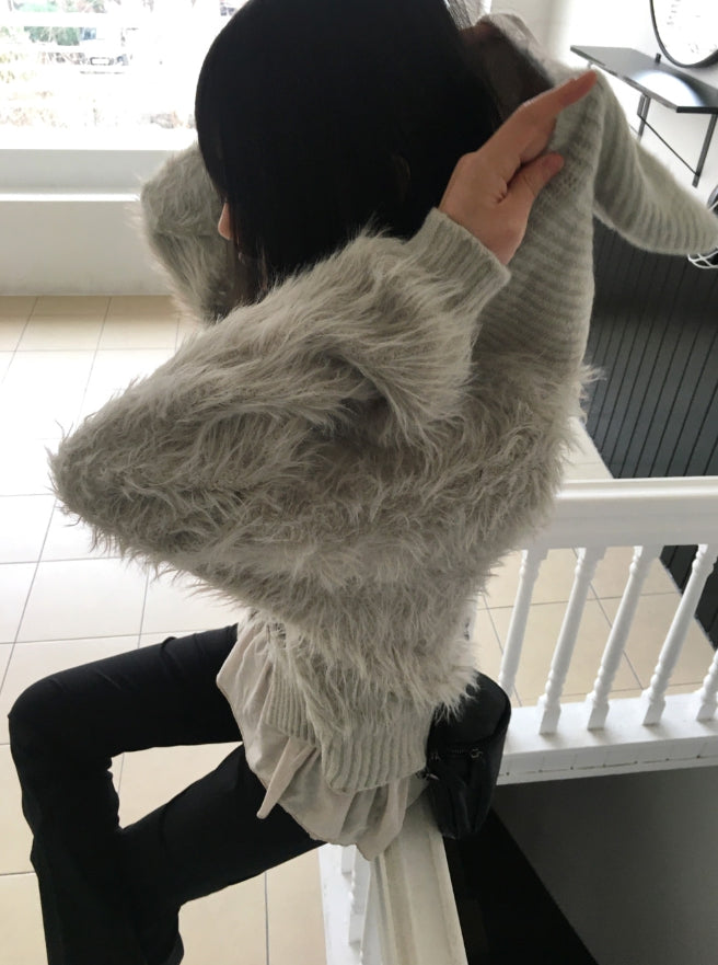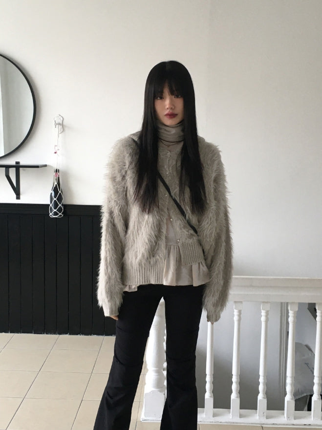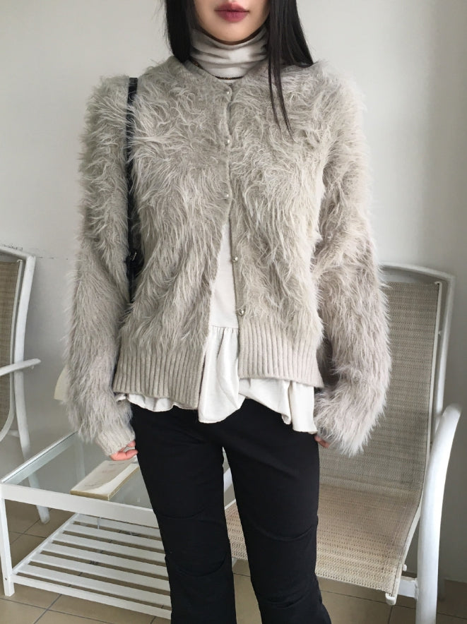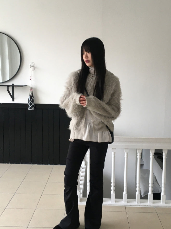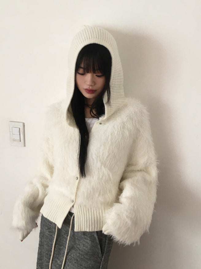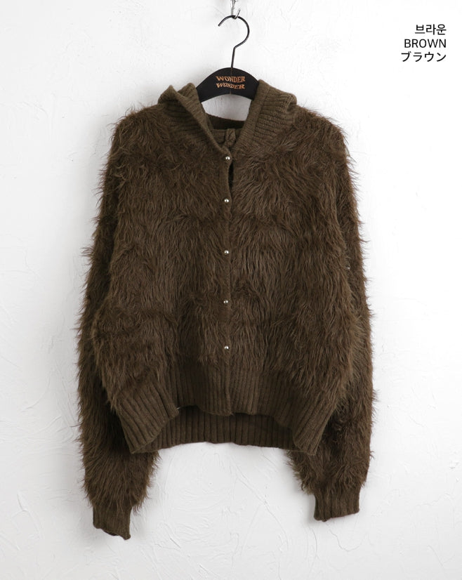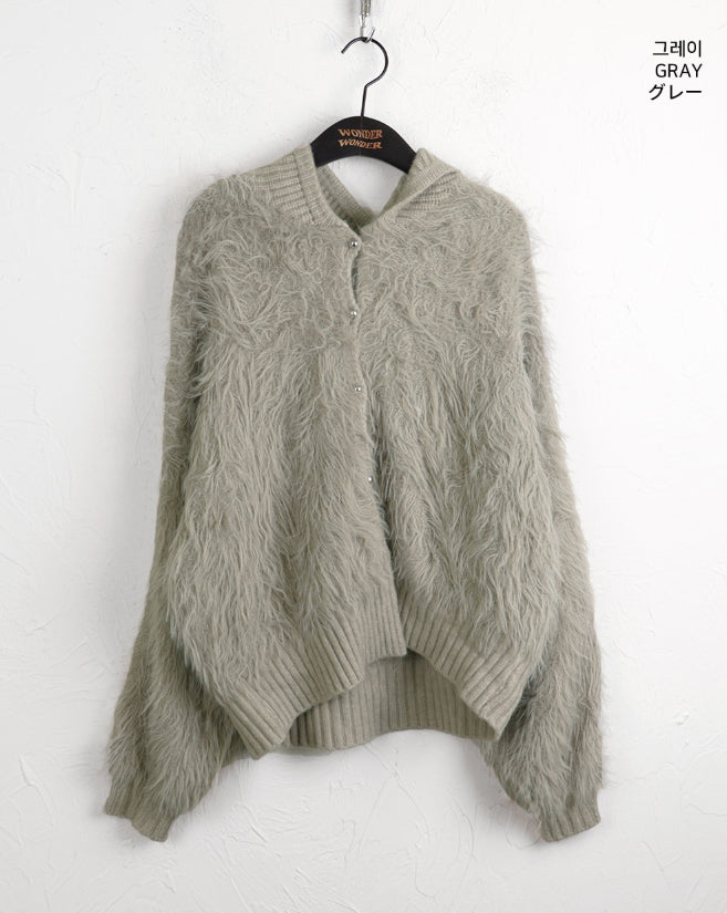 ソコニットカラーアンゴラファーボタンフードカーディガン