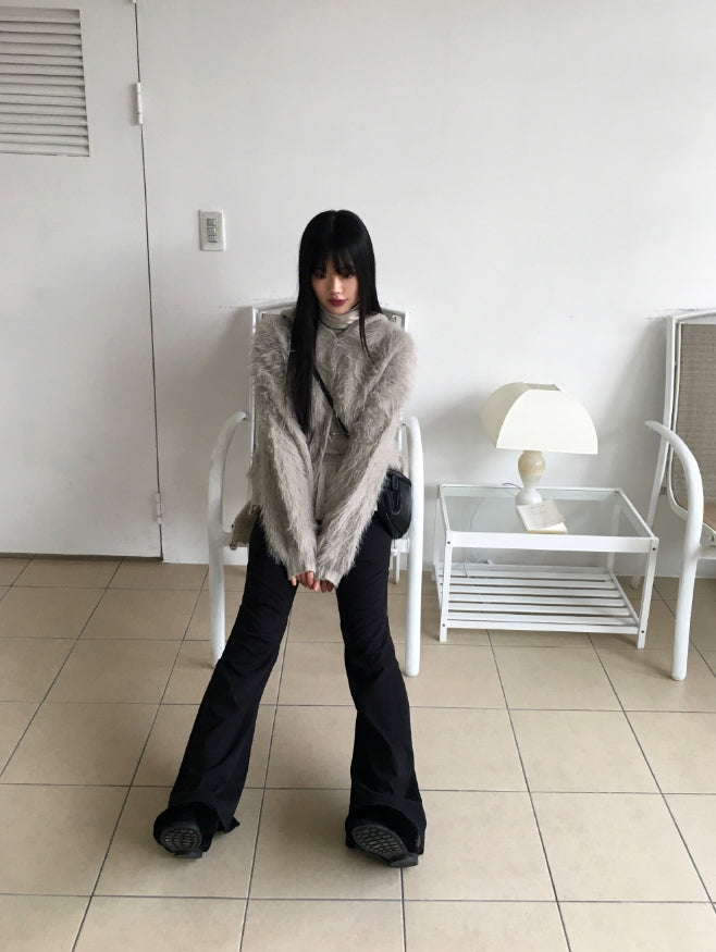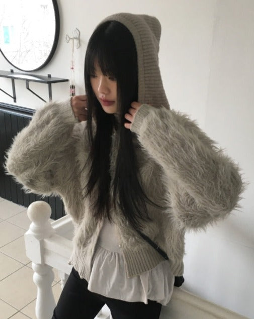 Soco Knitwear Color Matching Angora Fur Button Hood Cardigan