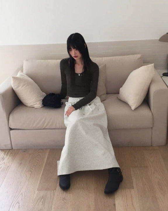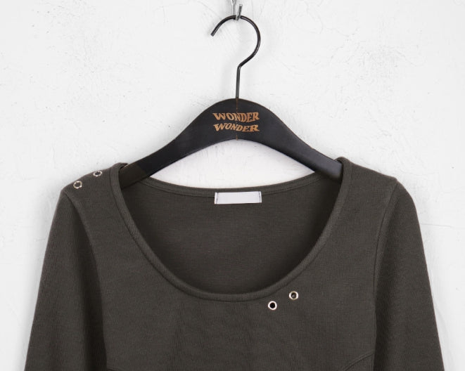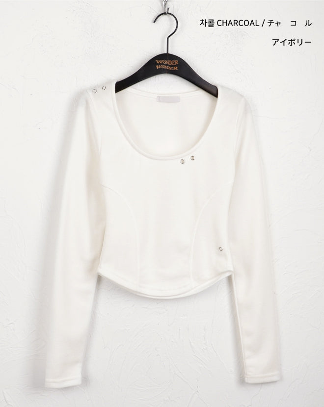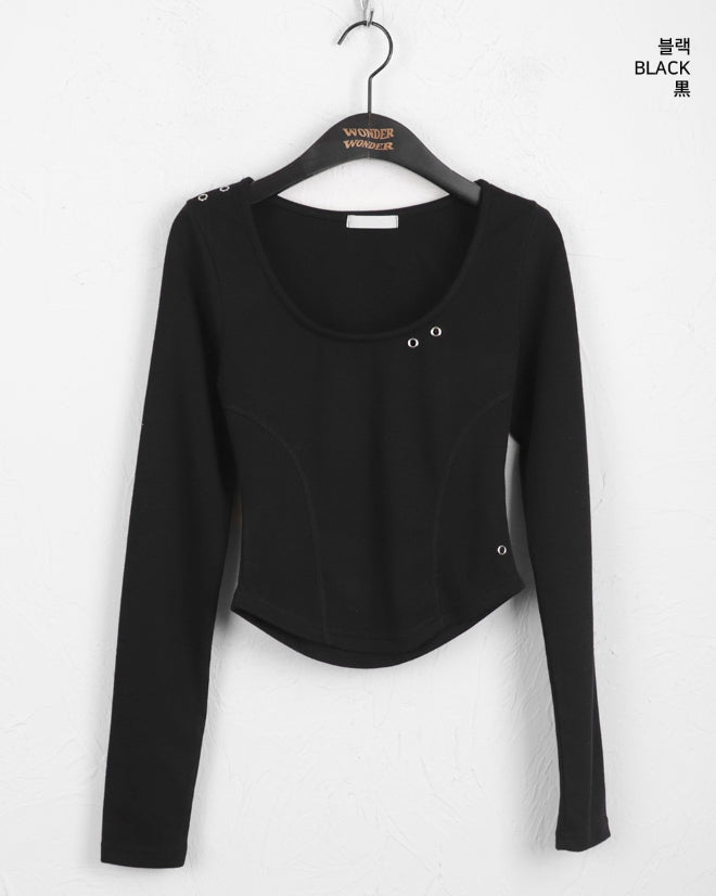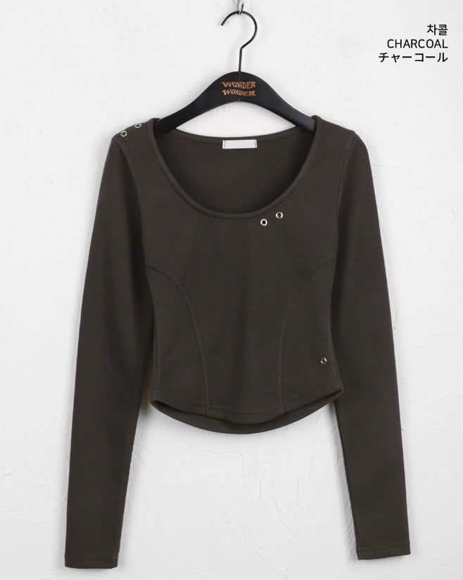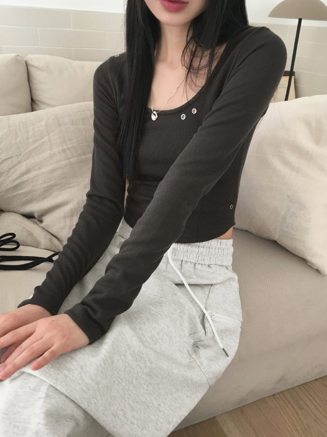 Suite eyelet incision u-neck roll cropped long-sleeved T-shirt