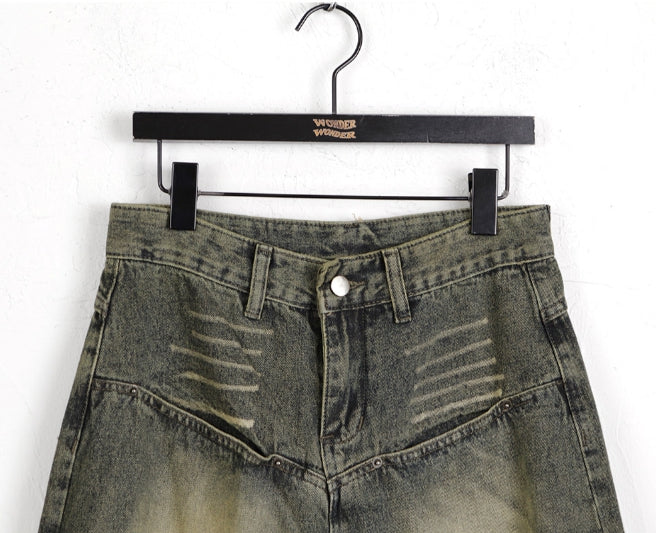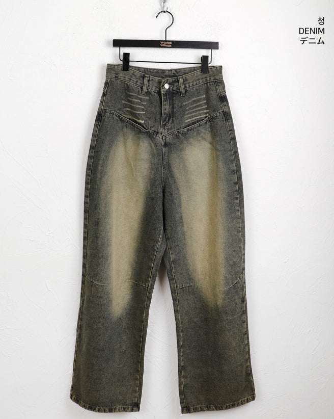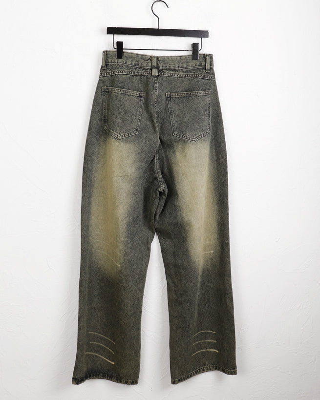 テッシングヒゲ加工ポケットデニムロングワイドパンツ