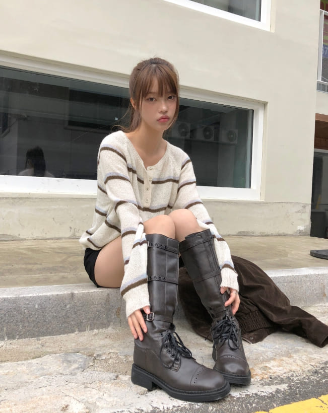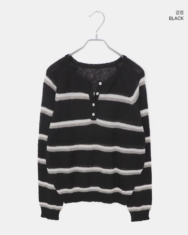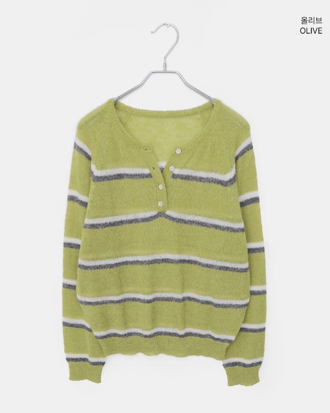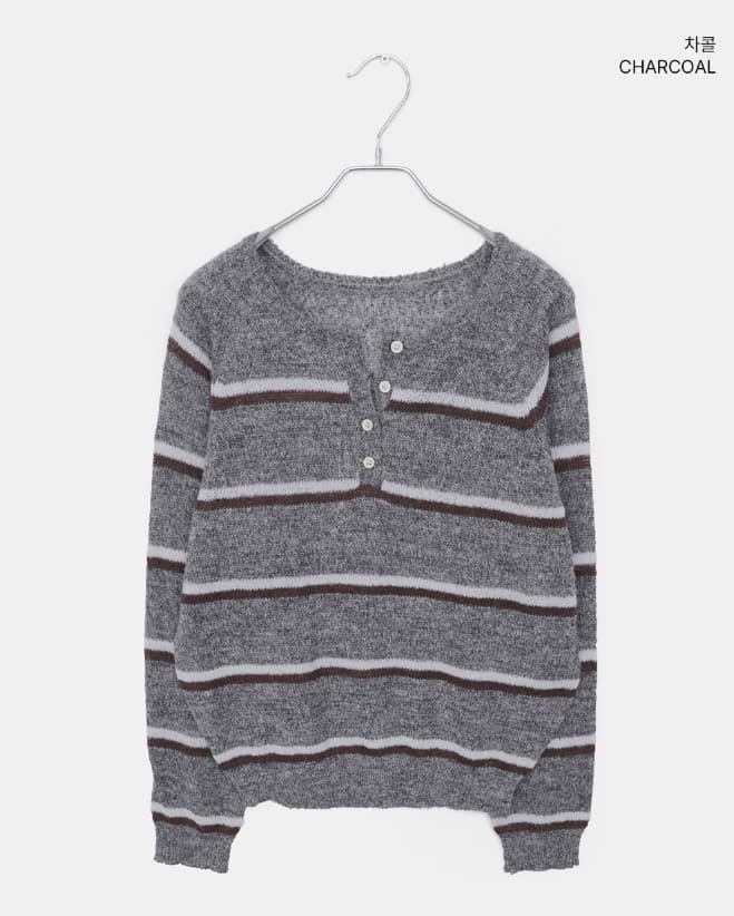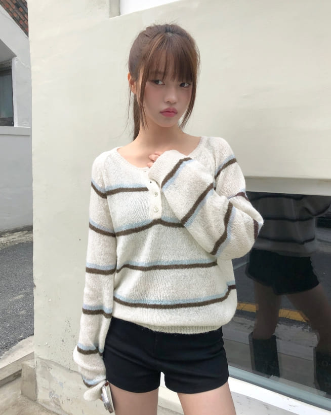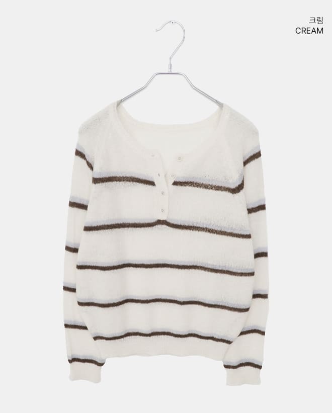 Tsen Stripe Button Henley Neck Long Sleeve Knit