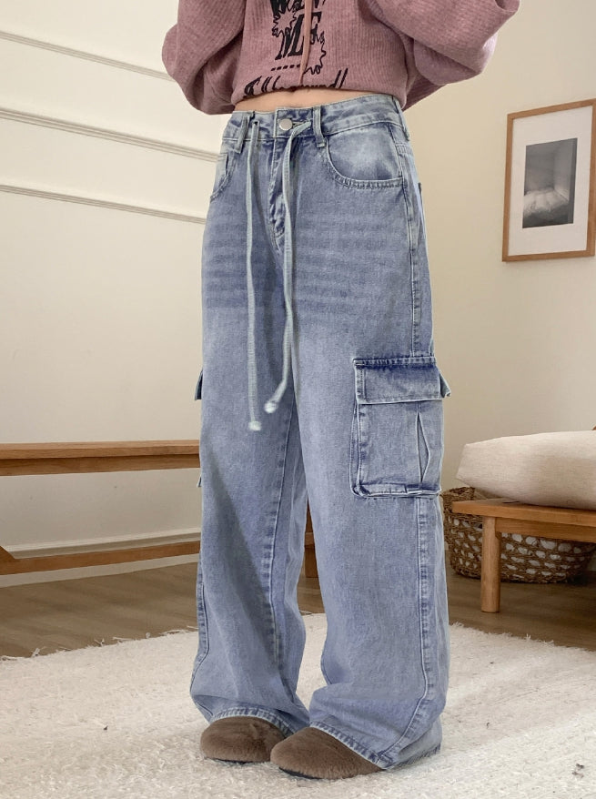 タービンストラップカーゴポケット洗濯デニムロングワイドパンツ