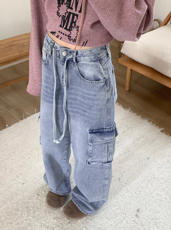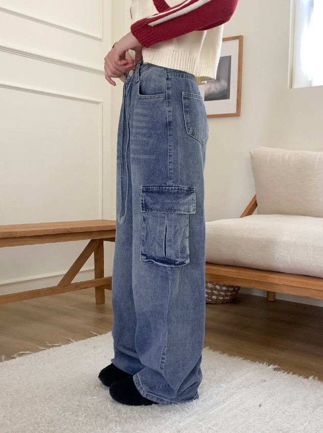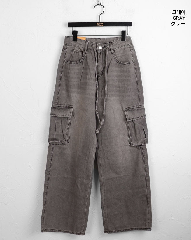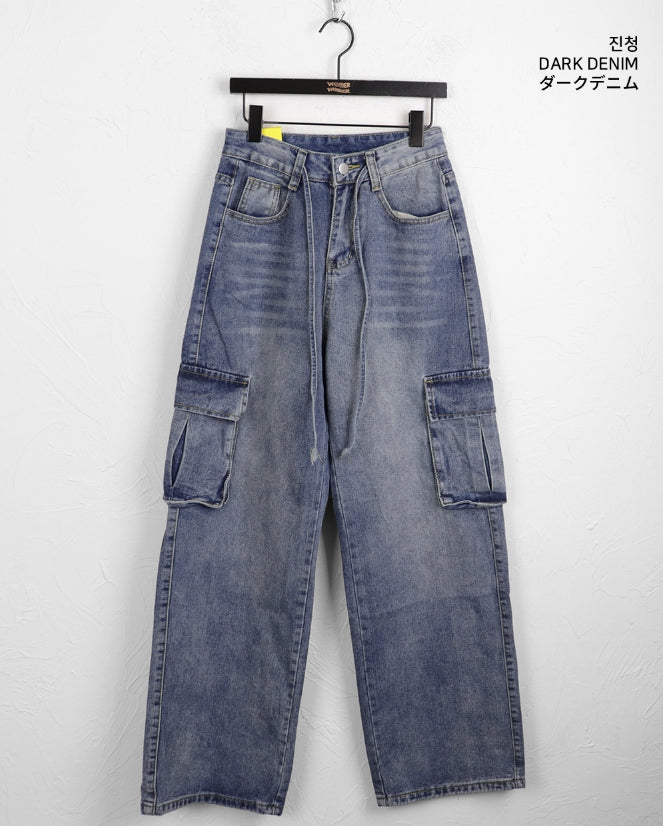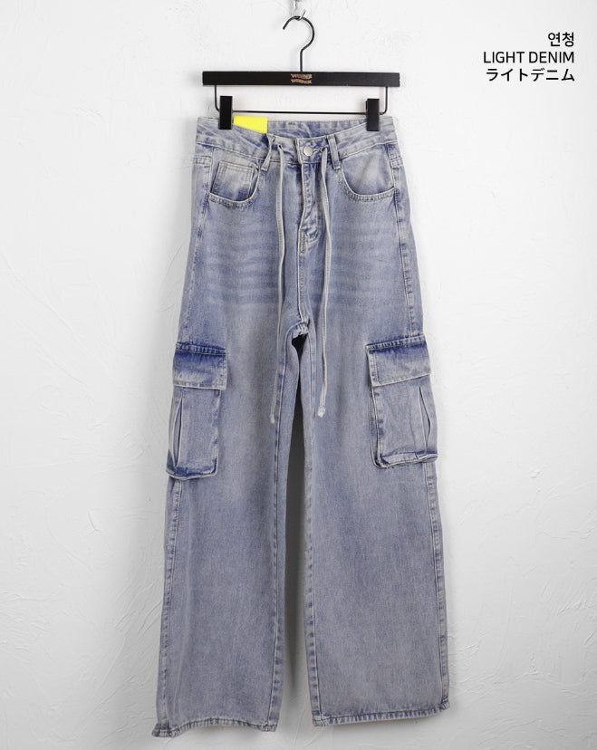 Turbine Strap Cargo Pocket Washing Denim Long Wide Pants