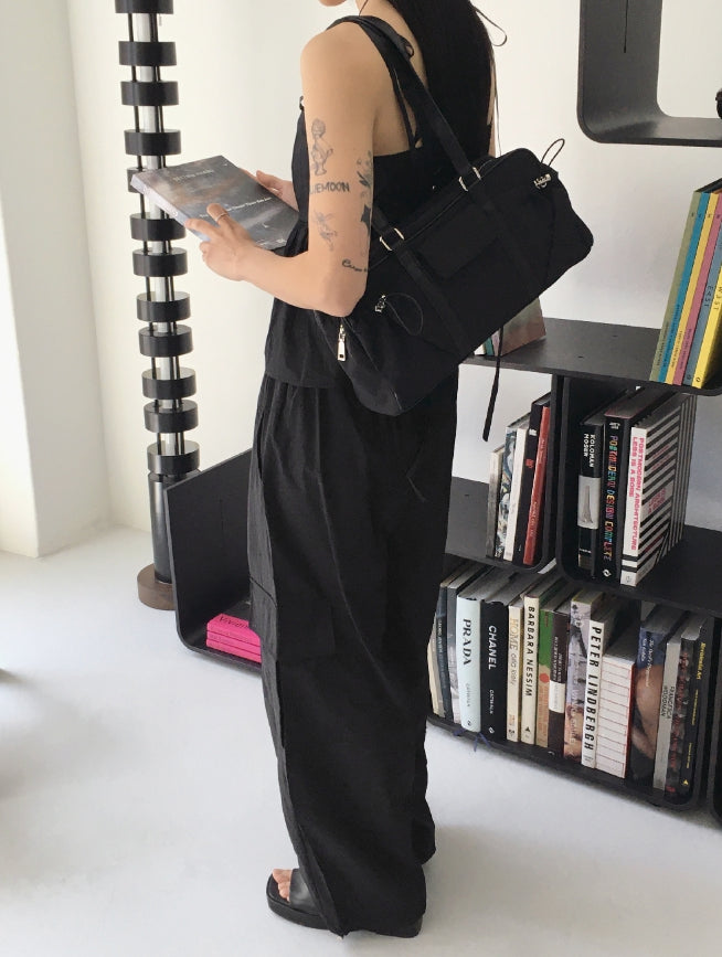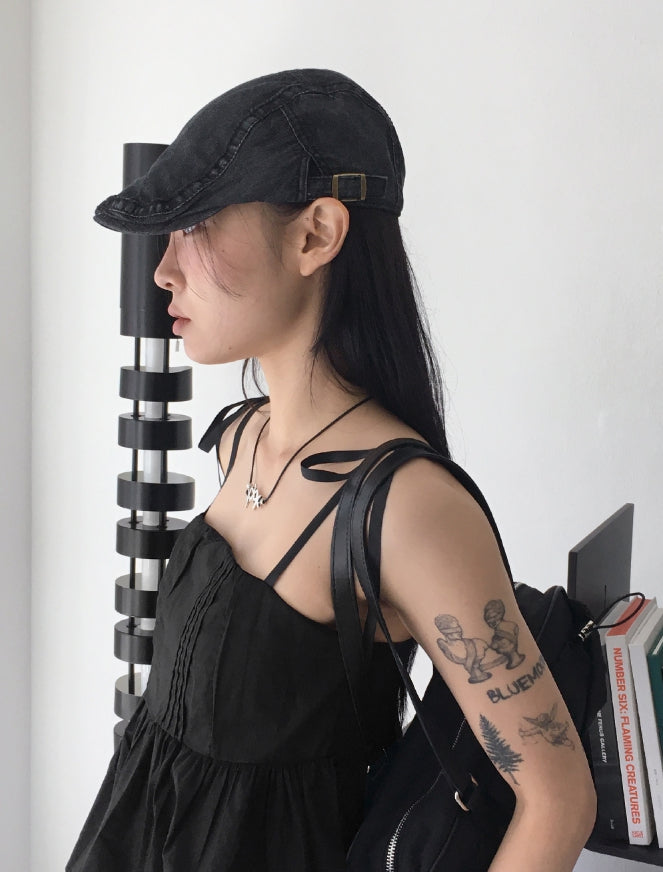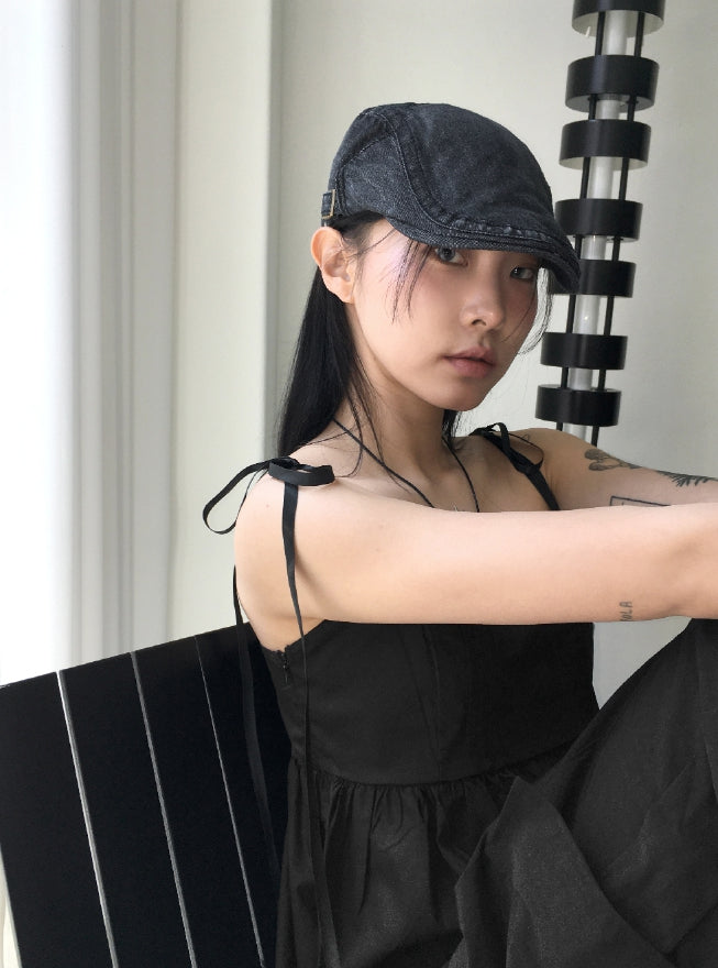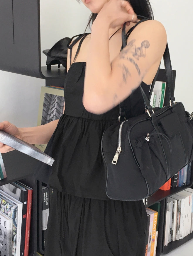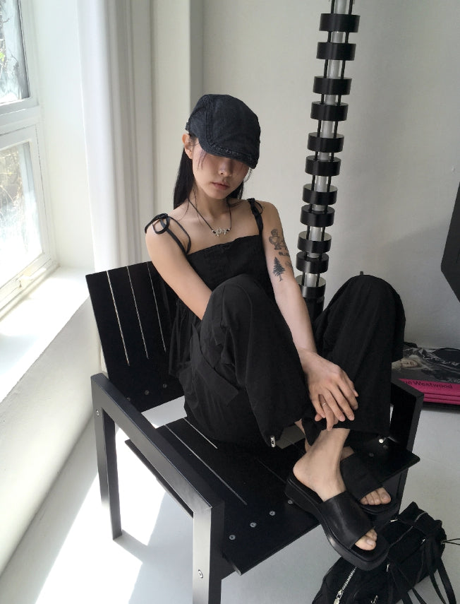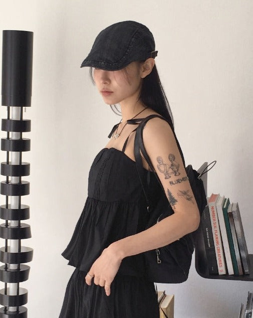 Tweed pintuck flared ribbon strap smoking sleeveless blouse