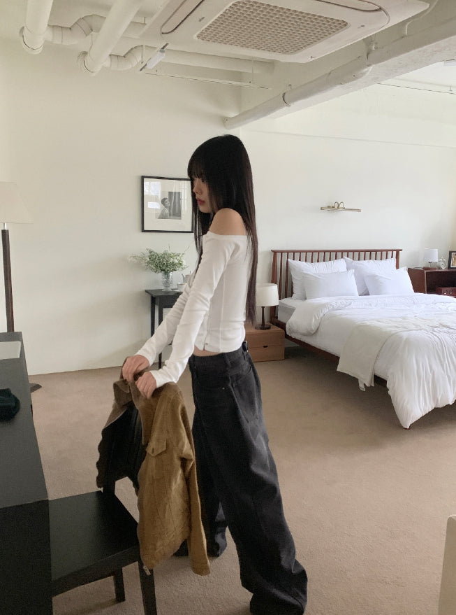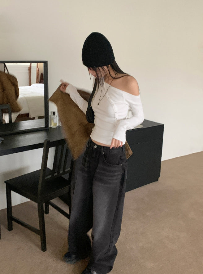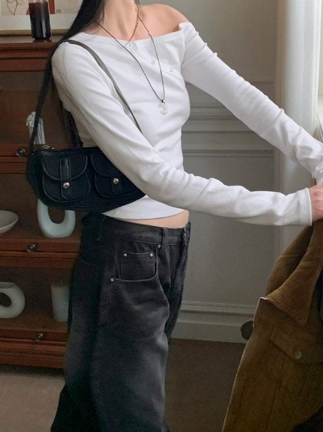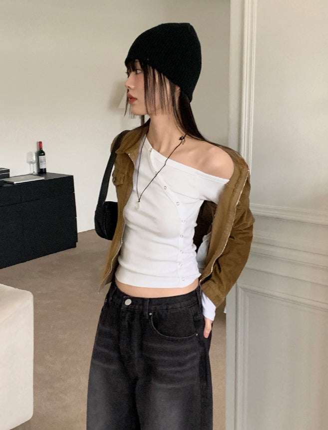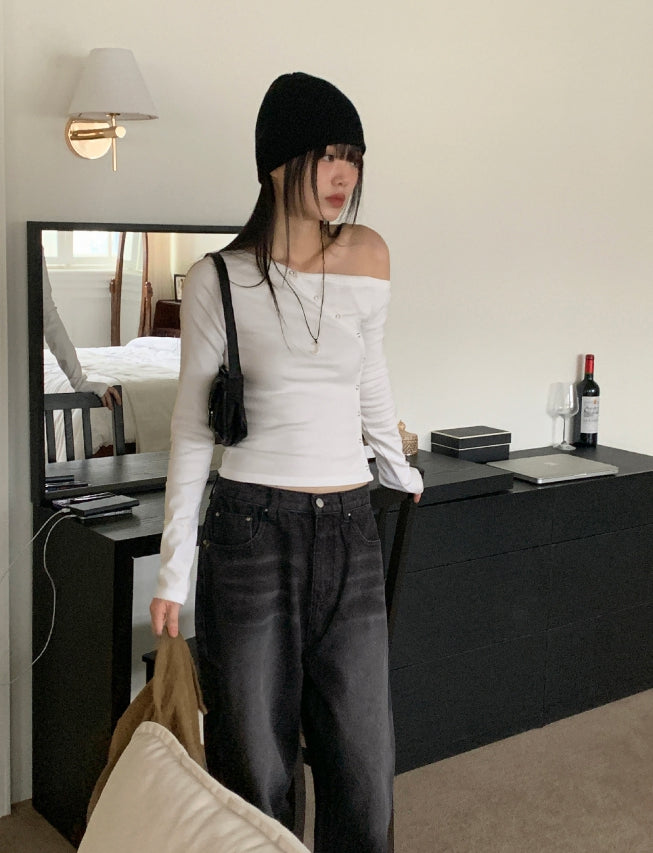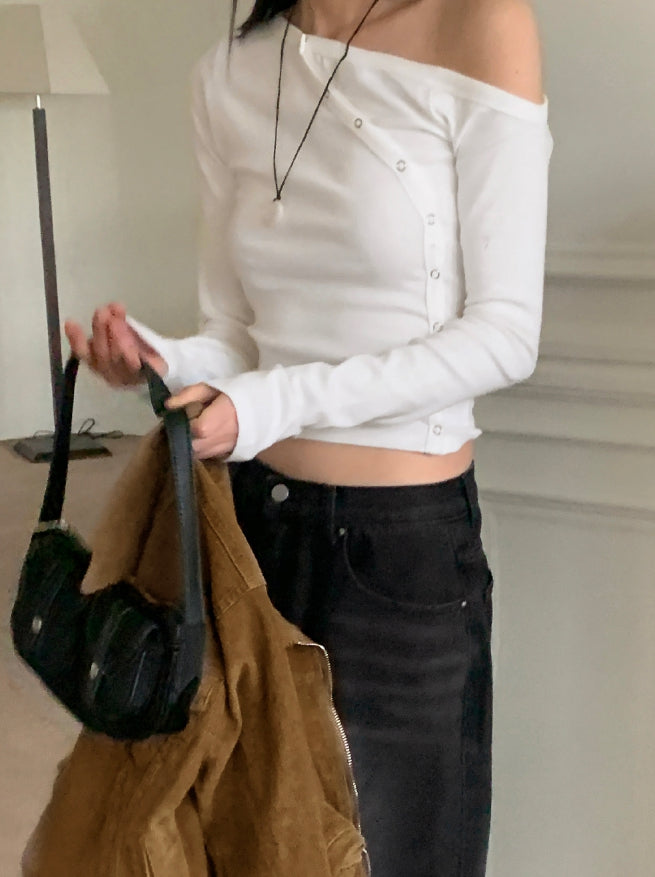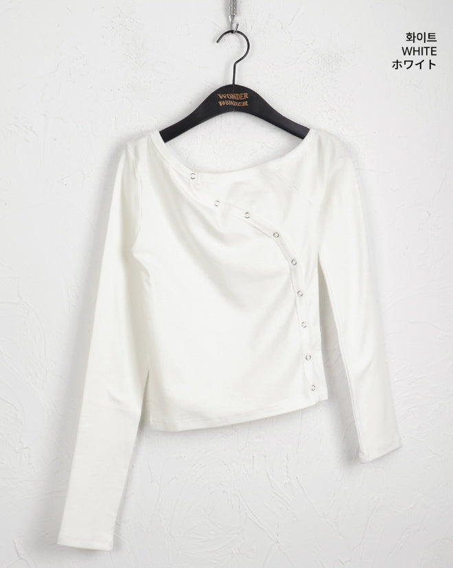 Vemon Unbalanced Shoulder Curve Snap Button Long-Sleeved Cardigan T-shirt