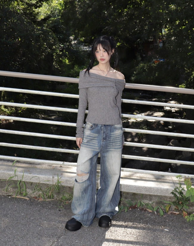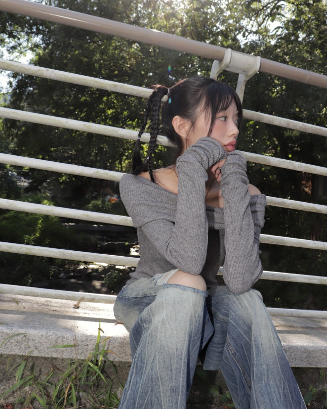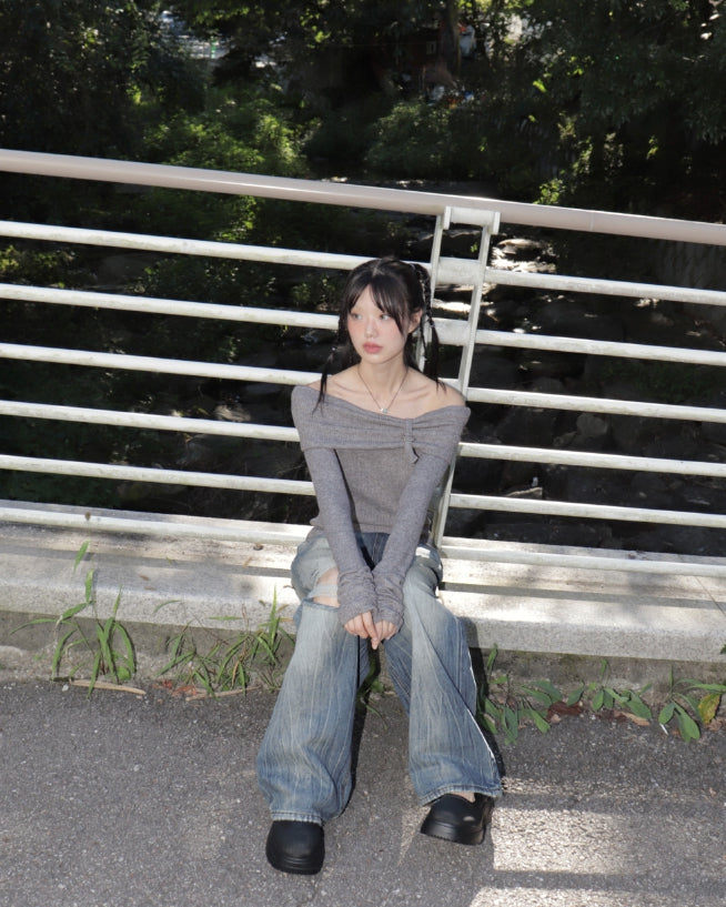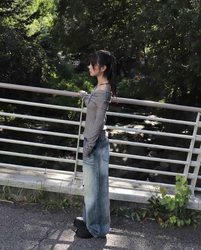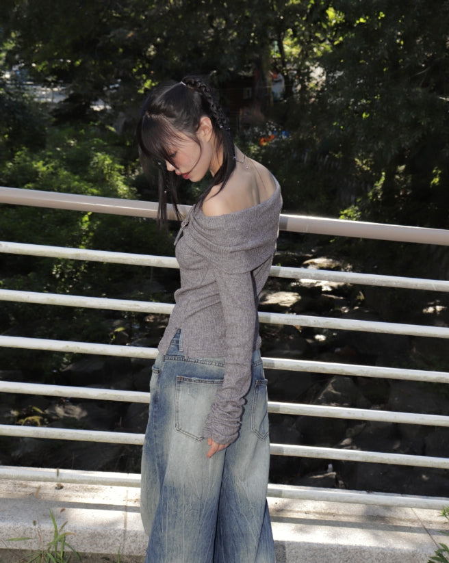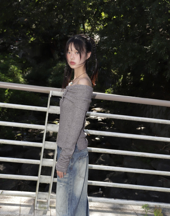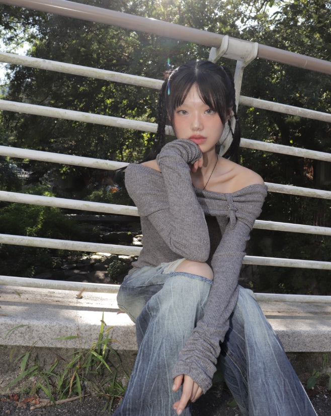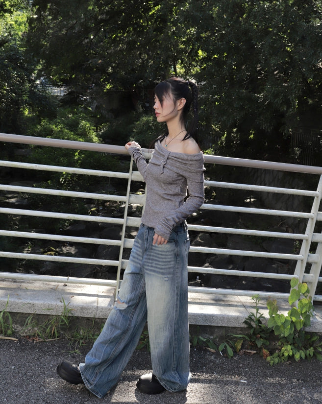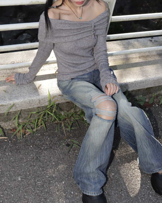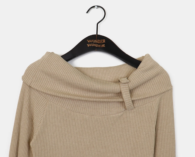 ビジョンベルトバックルシャーリングリブオフショルダーTシャツ