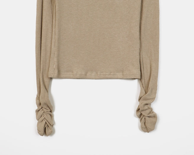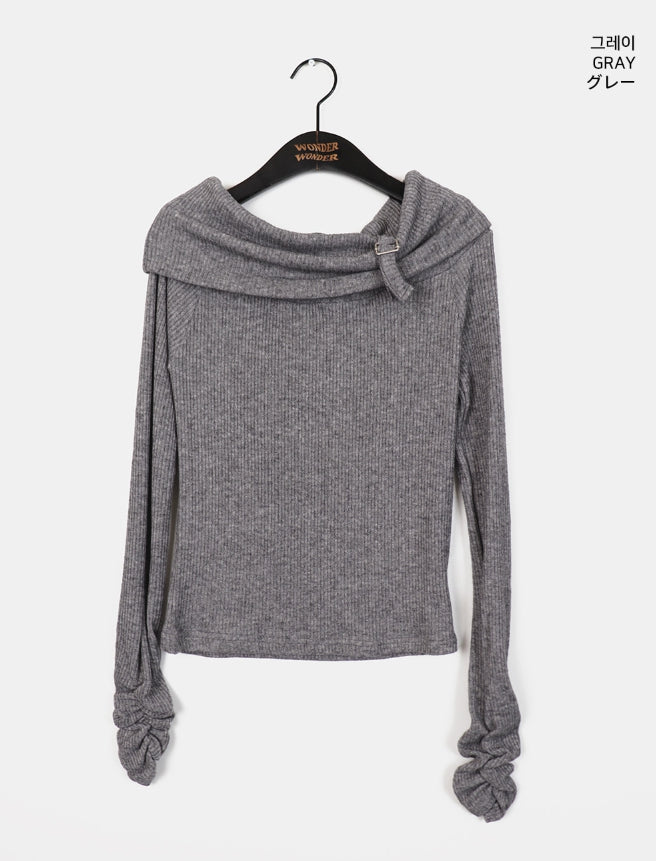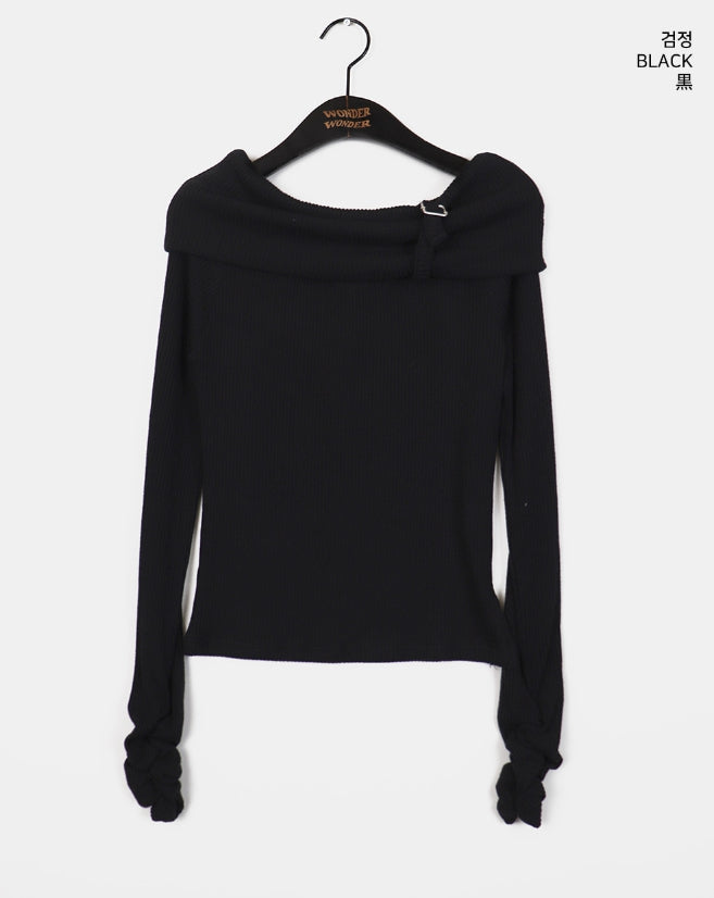Vision Belt Buckle Shirring Ribbed Off-Shoulder T-Shirt