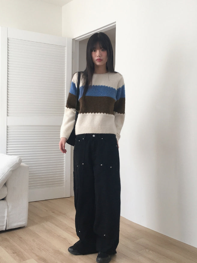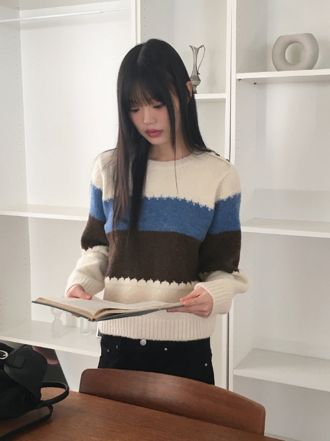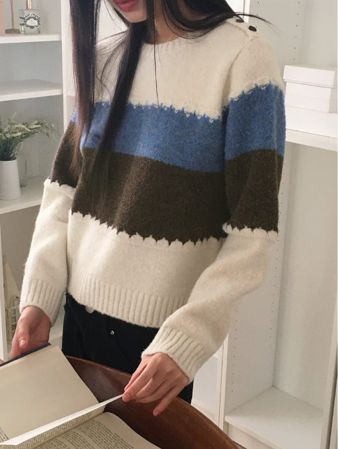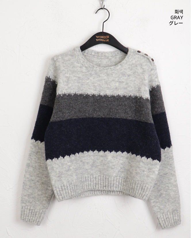 Wool Stripe Color Matching Button Round Long Sleeve Knitwear