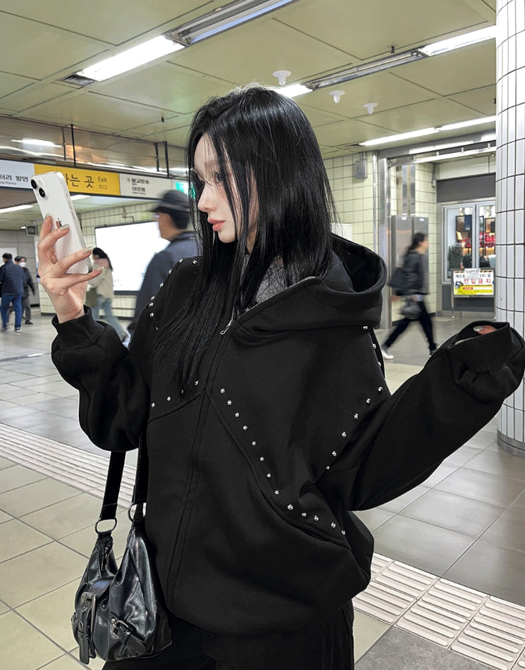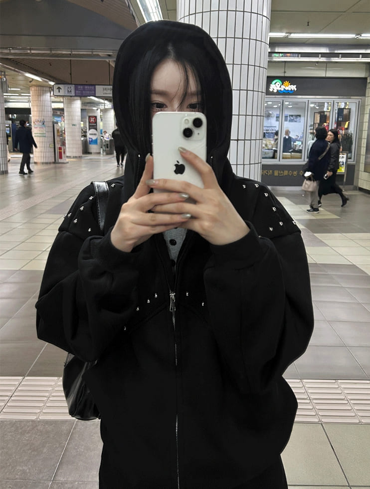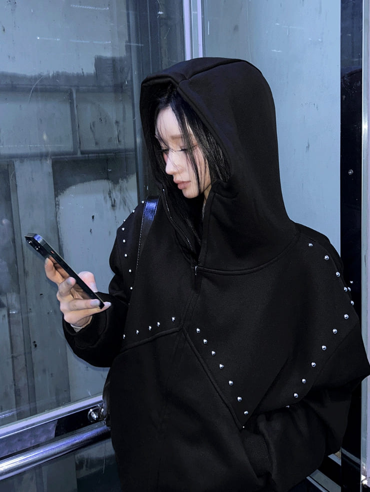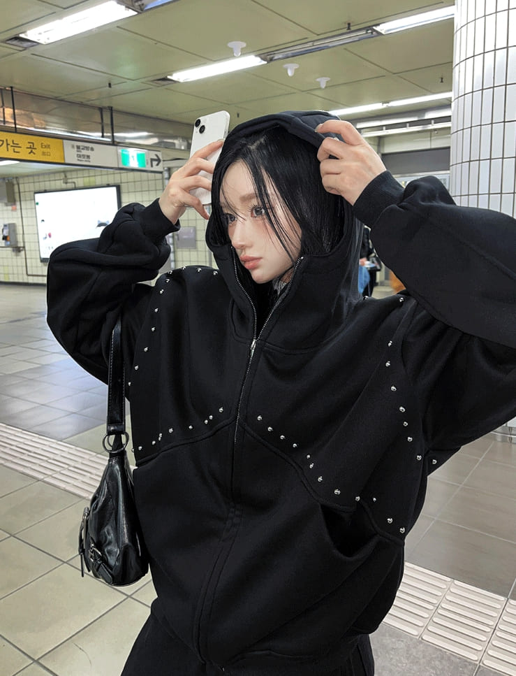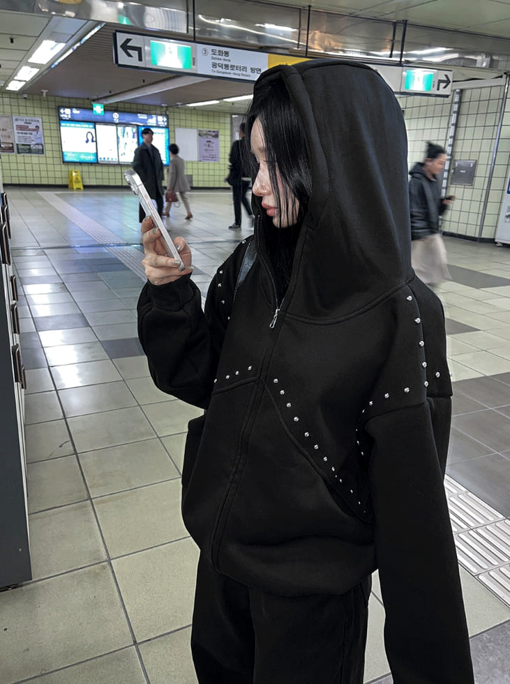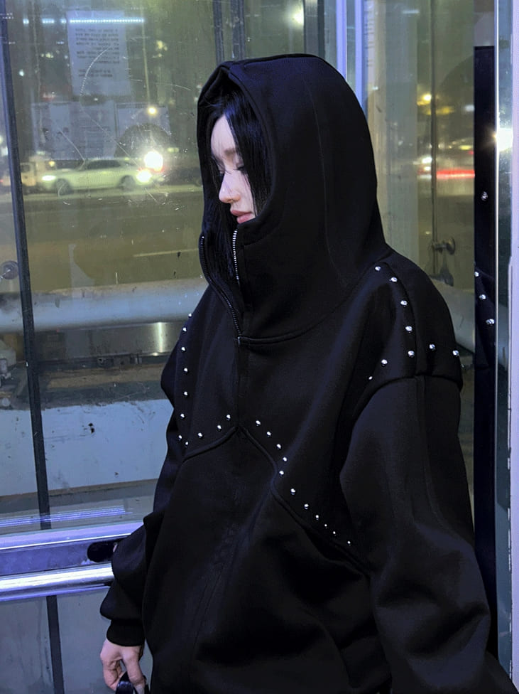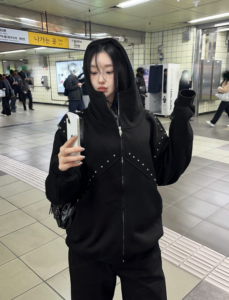 [Brushed Lining] Metallic Studded Over Hood Zip-Up