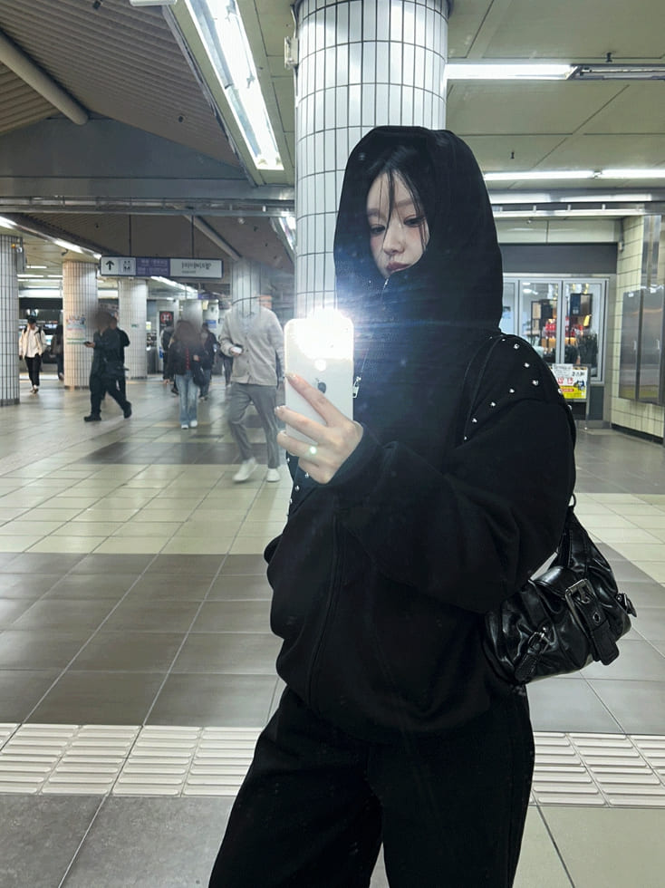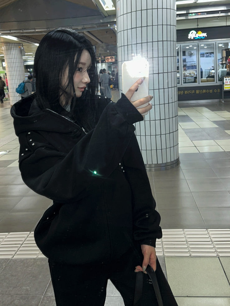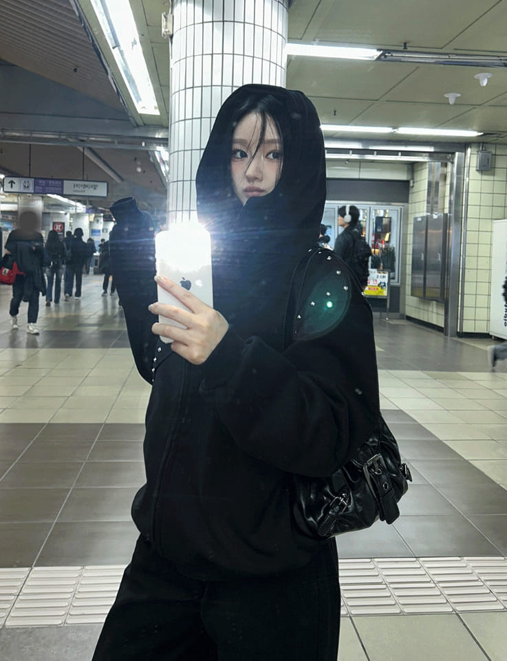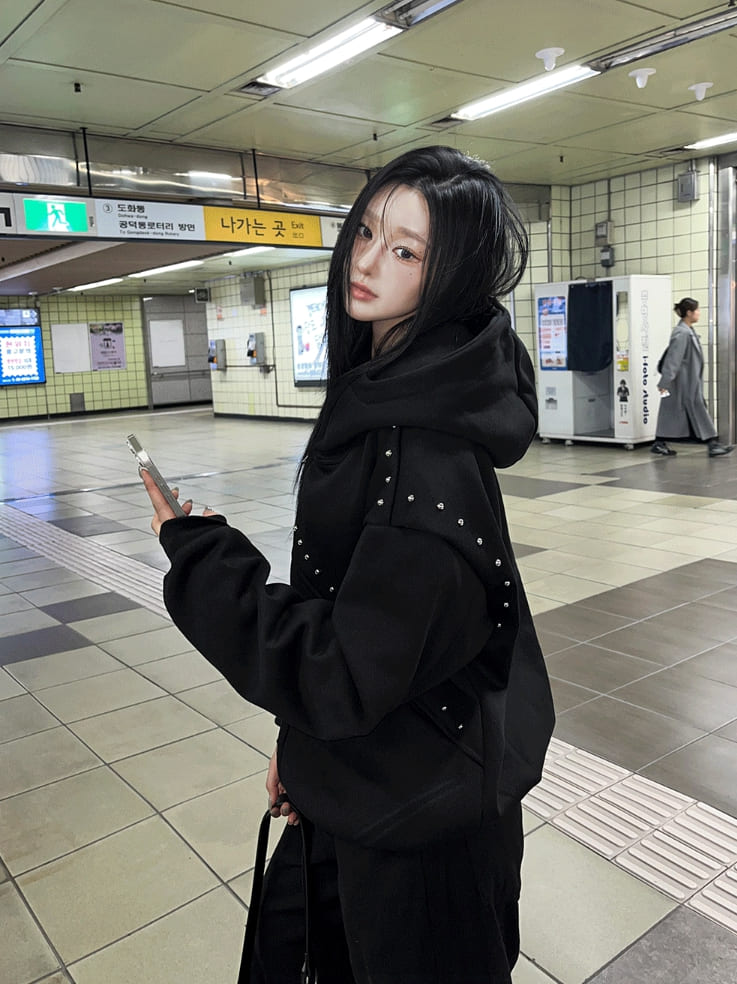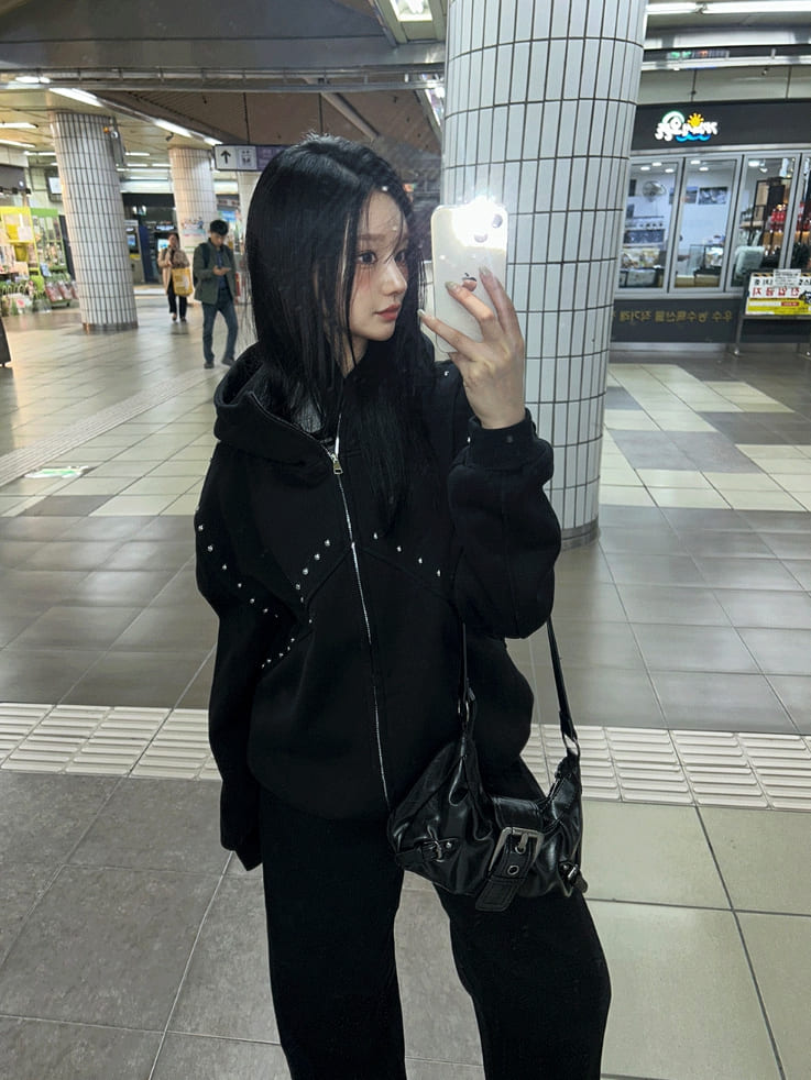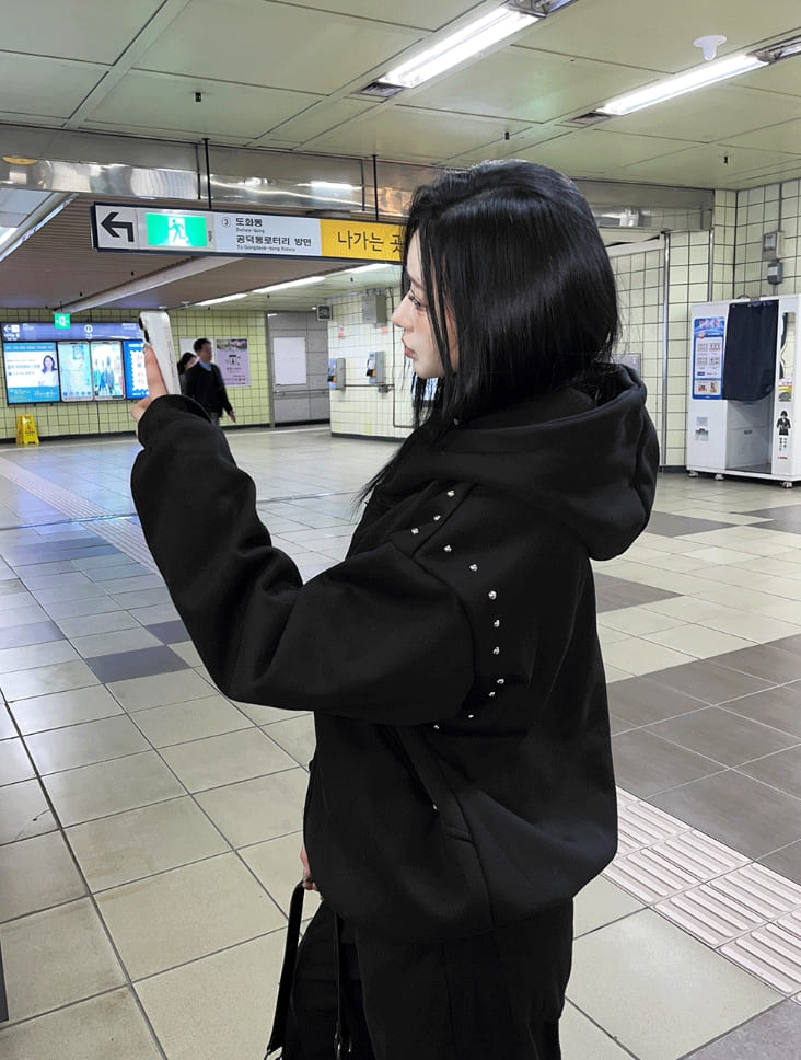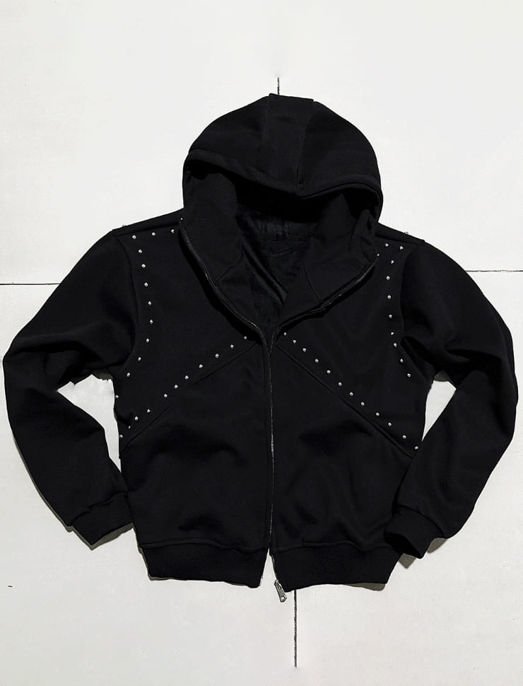 [Brushed Lining] Metallic Studded Over Hood Zip-Up