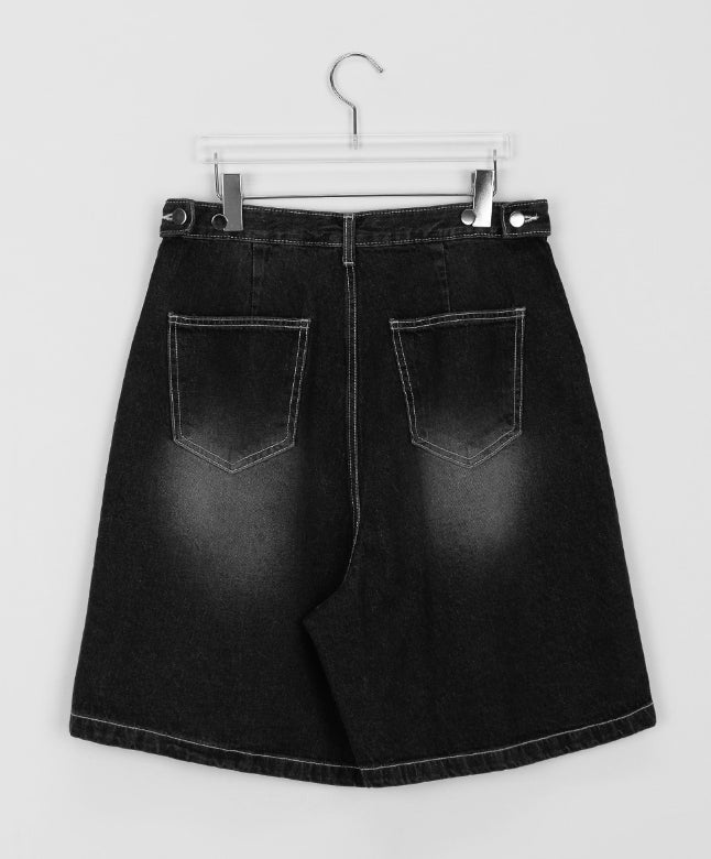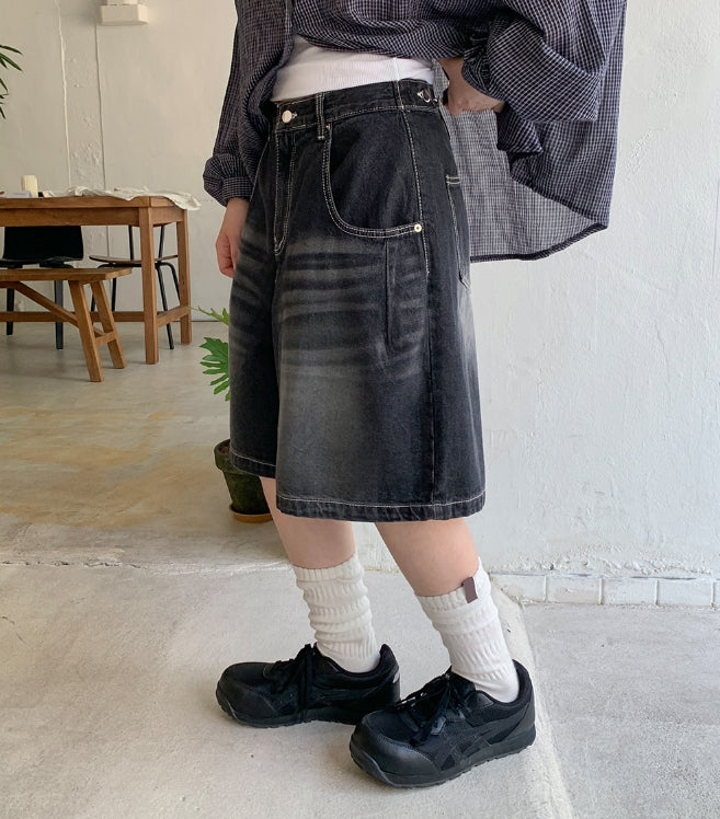 ミティキピンタックビジョブラックブルーバミューダデニムパンツ