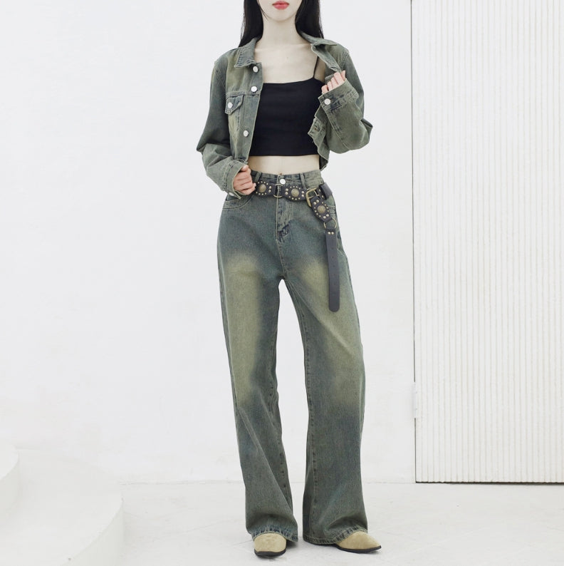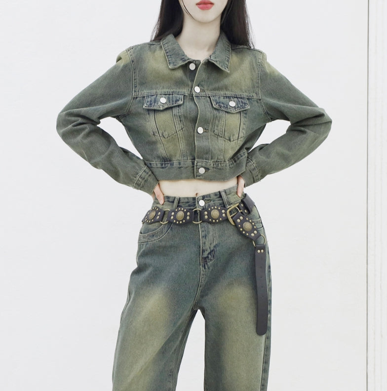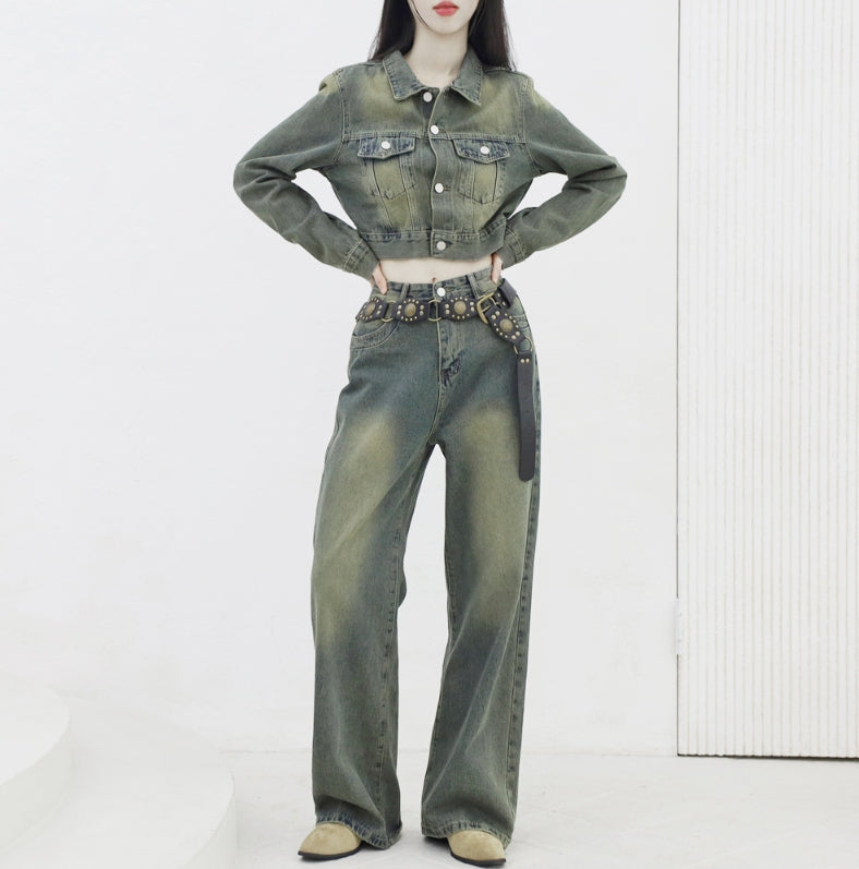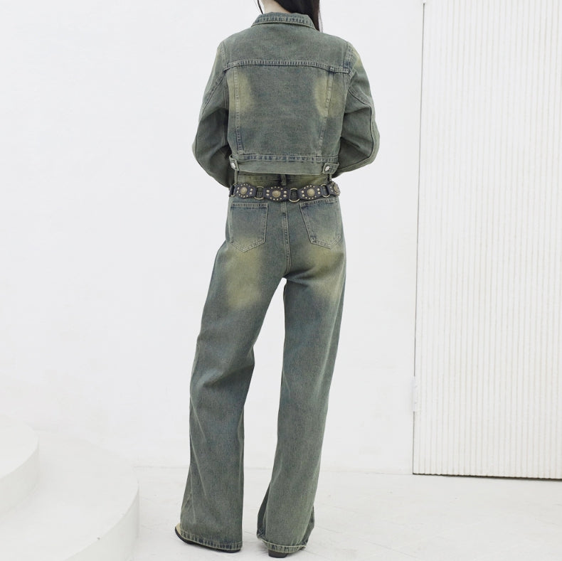 [NONCODE] Laure Denim Crop Jacket + Denim Pants Set