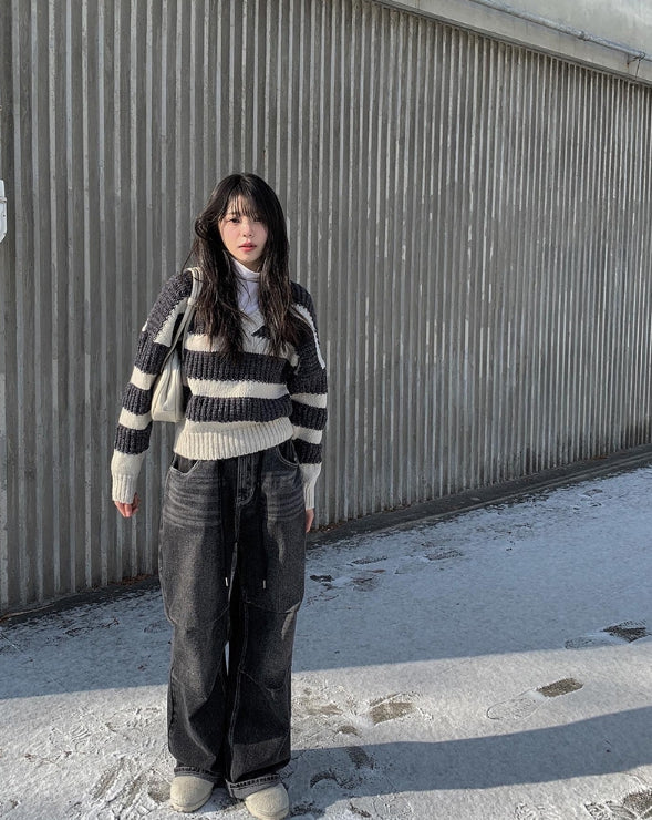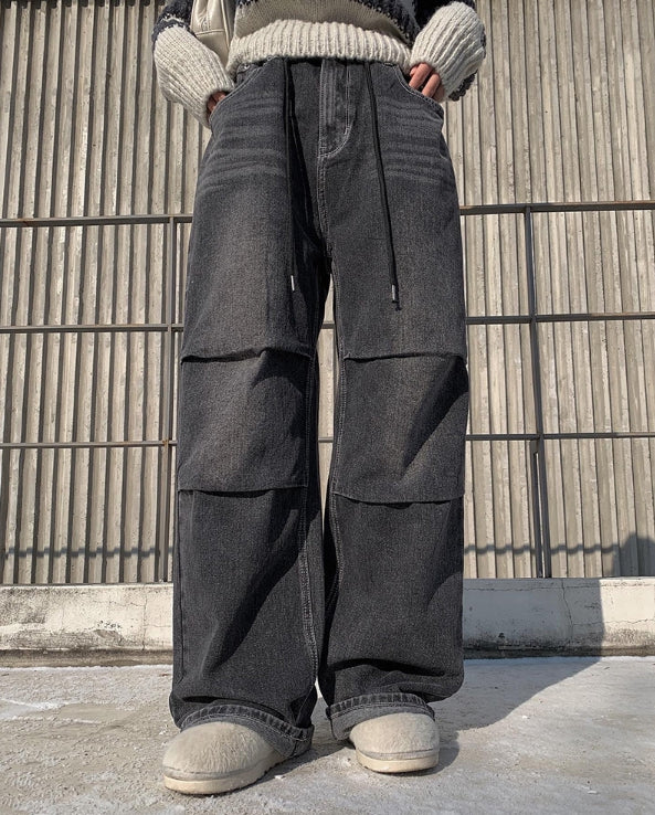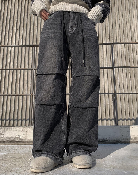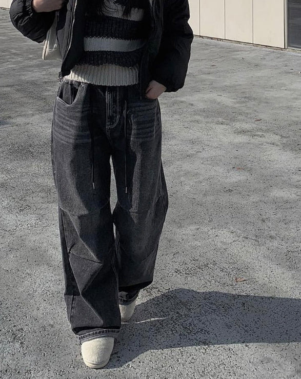 Rising black blue strap wide pants