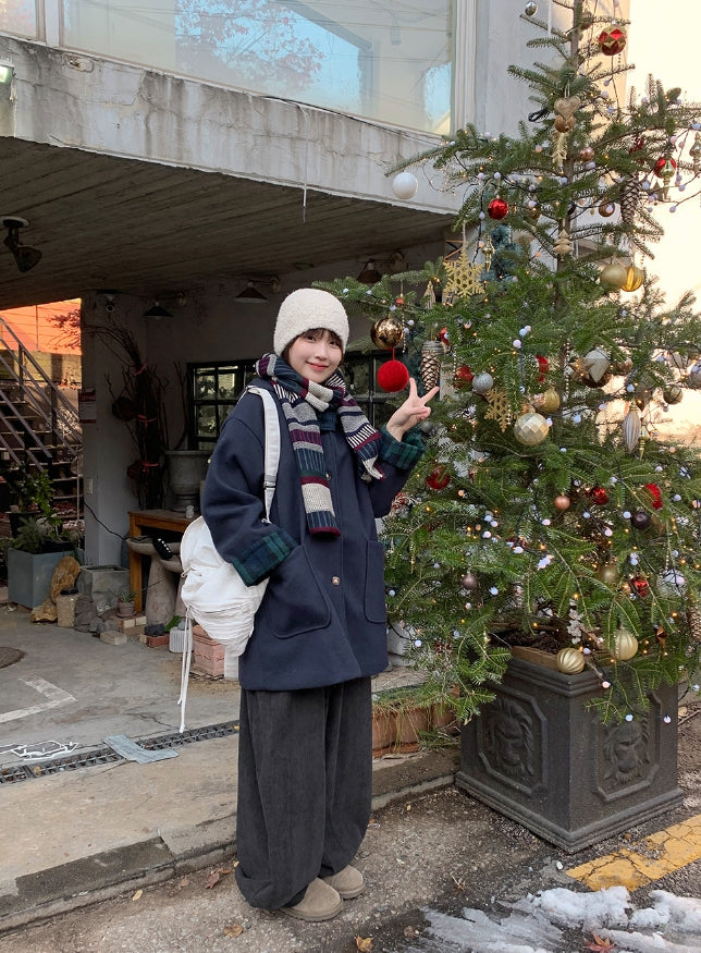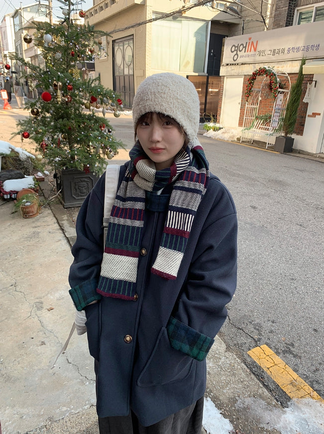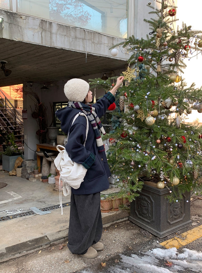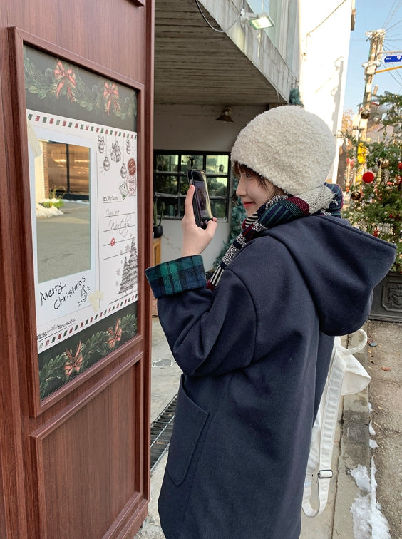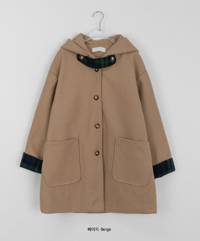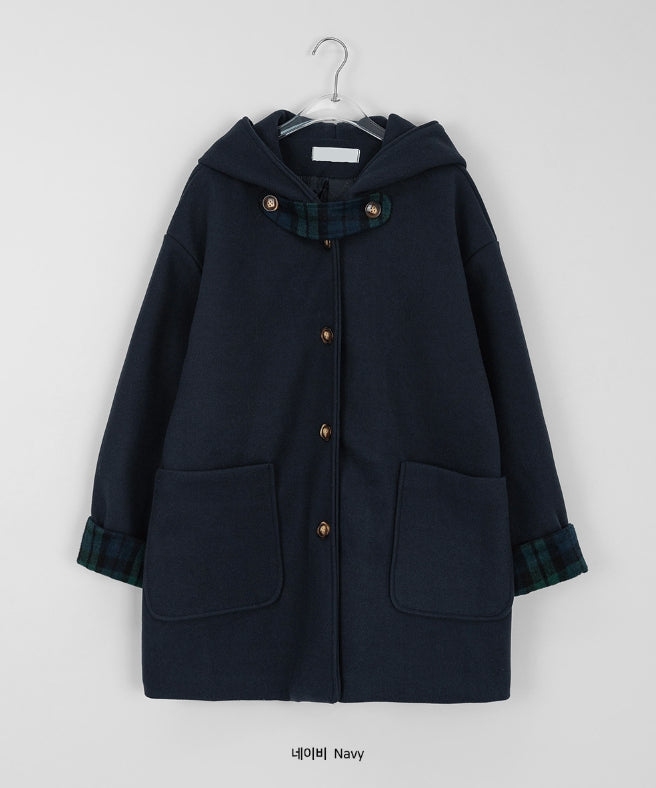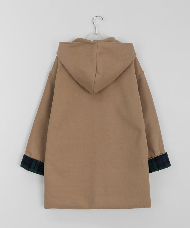 ティコイチェックカラーダッフルキルティングフードウールハーフコート