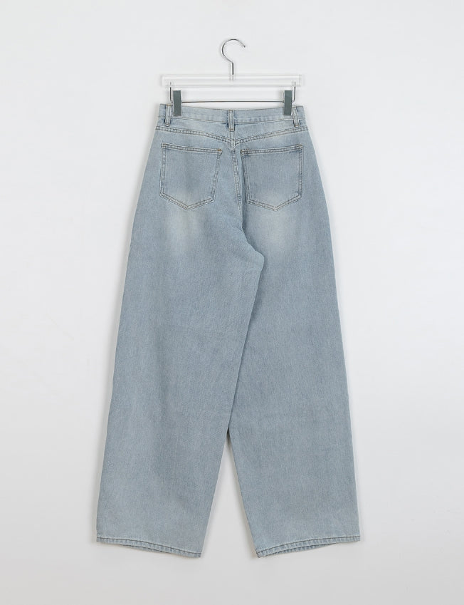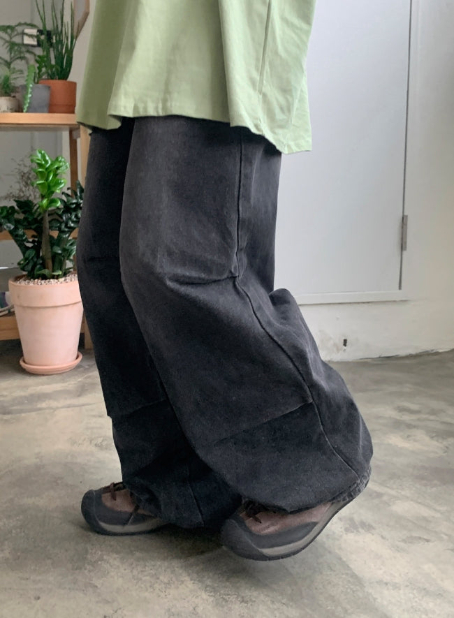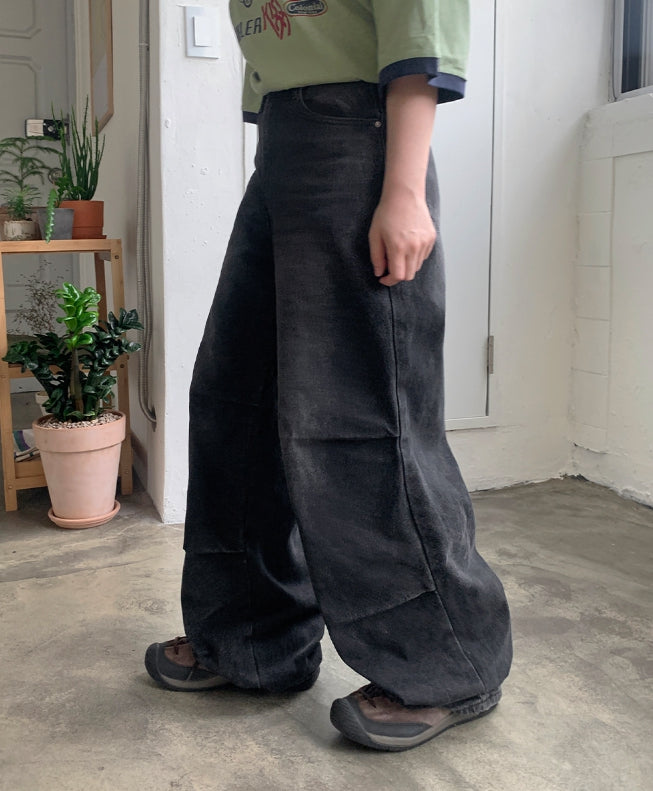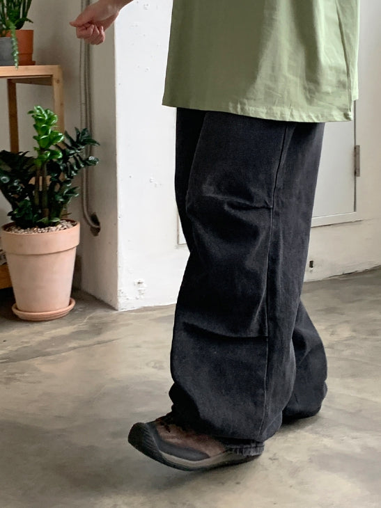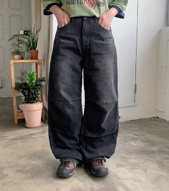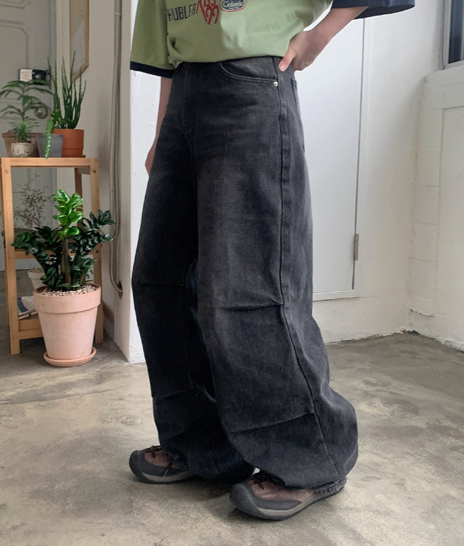 [男女兼用]デフウォッシュ加工ワイドパラシュートデニムパンツ