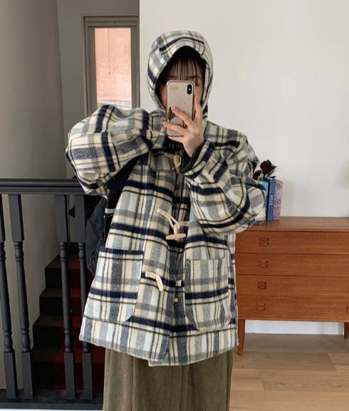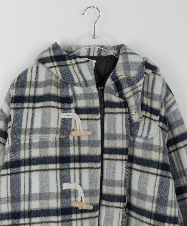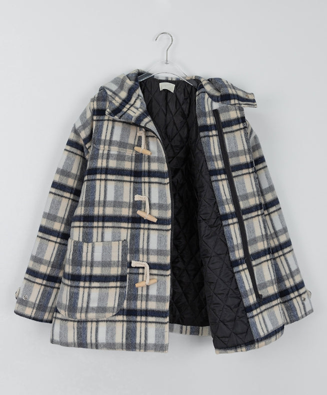 [男女兼用]ドニコチェックダッフルキルティングフードハーフコート